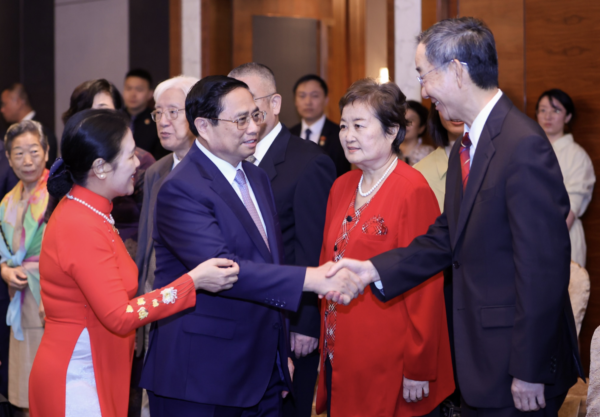 Thủ tướng Phạm Minh Chính trò chuyện cùng các trí thức Trung Quốc đã giúp đỡ Việt Nam. Ảnh: Nhật Bắc