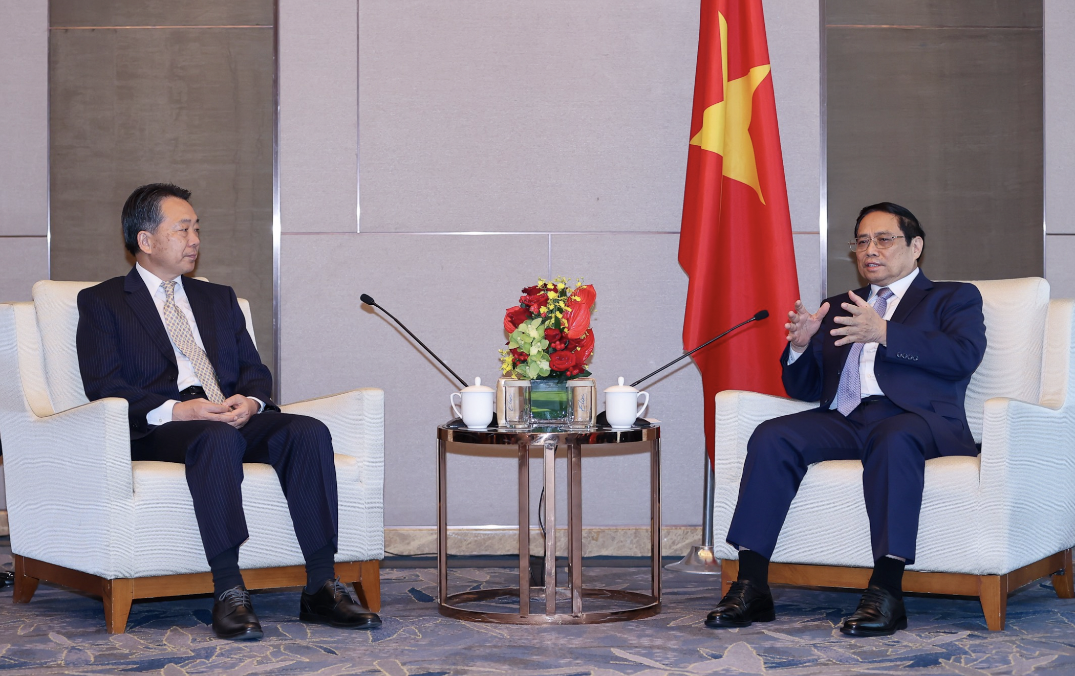 Thủ tướng Phạm Minh Chính trao đổi cùng Phó Hội trưởng Hội Hữu nghị đối ngoại nhân dân Trung Quốc Viên Mẫn Đạo. Ảnh: Nhật Bắc