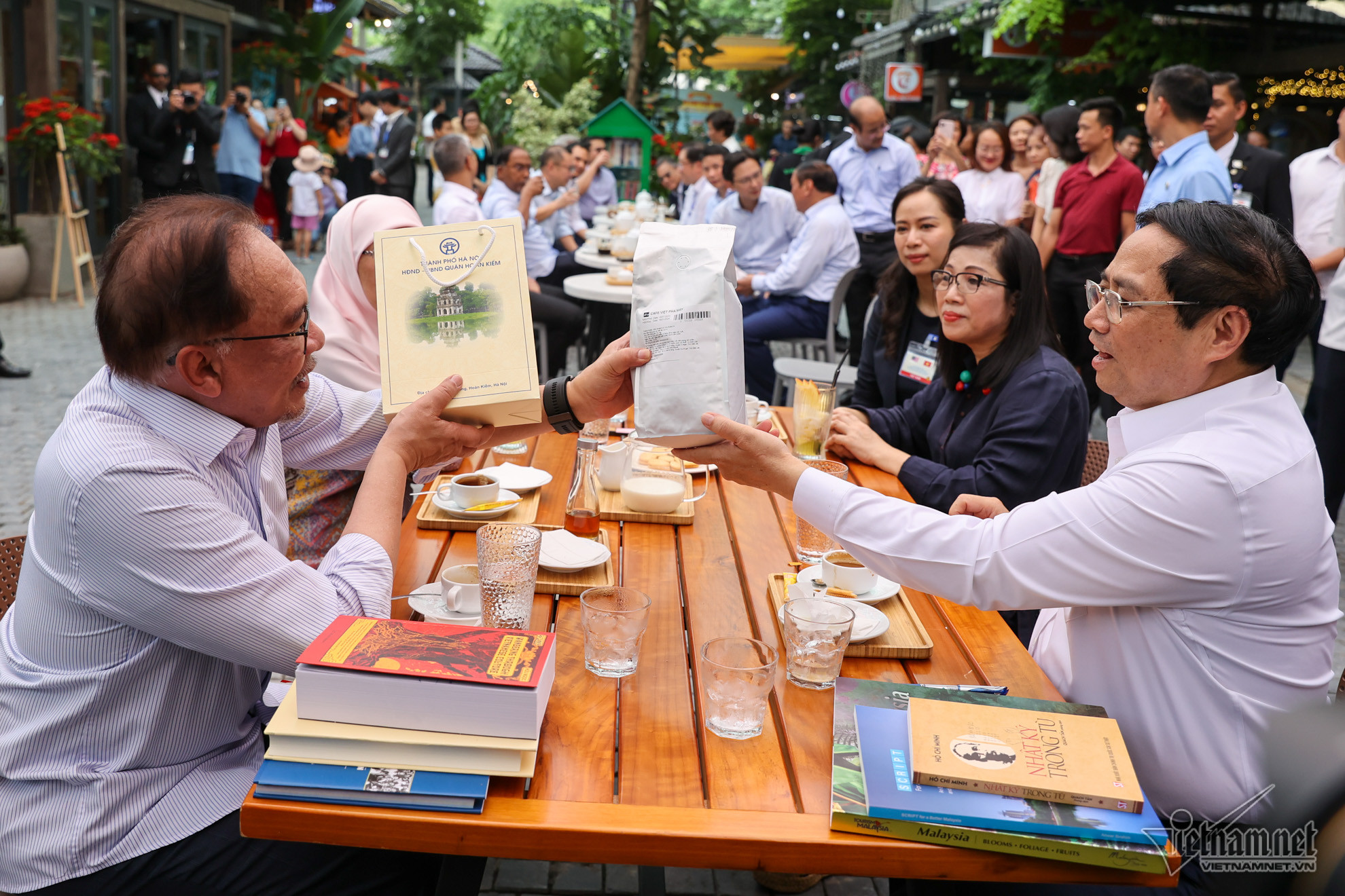 Dưới tán cây xanh chính giữa Phố Sách, hai Thủ tướng và hai phu nhân đã dừng lại một quán cà phê sách để thưởng thức cà phê, trao đổi về văn hóa đọc và một số cuốn sách.