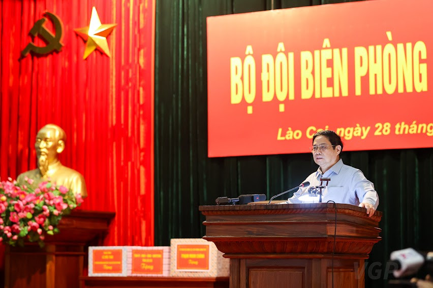 Vì vậy, Thủ tướng đề nghị Bộ đội Biên phòng Lào Cai tiếp tục triển khai thực hiện có hiệu quả chủ trương, đường lối của Đảng, chính sách, pháp luật của Nhà nước; chỉ thị, mệnh lệnh, kế hoạch của Bộ Quốc phòng, Bộ Tư lệnh Bộ đội Biên phòng, Bộ Tư lệnh Quân khu 2, Tỉnh ủy, UBND tỉnh Lào Cai về nhiệm vụ quân sự, quốc phòng, công tác biên phòng. Trong đó, trọng tâm là Nghị quyết số 33-NQ/TW của Bộ Chính trị về Chiến lược bảo vệ biên giới quốc gia; Nghị quyết số 16-NQ/TW của Bộ Chính trị về phát triển kinh tế-xã hội các xã biên giới đất liền kết hợp với tăng cường và củng cố quốc phòng, an ninh, đối ngoại.