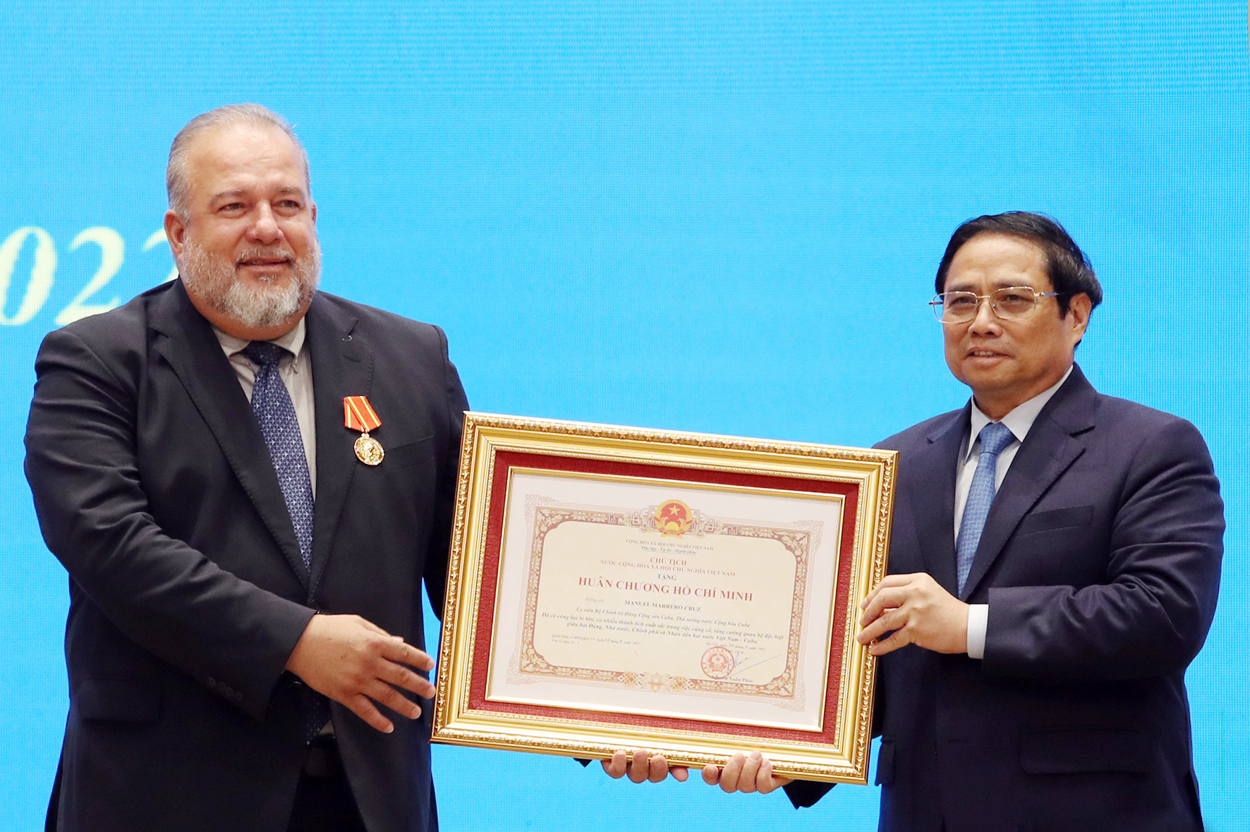 Thủ tướng Cuba Manuel Marrero Cruz vui mừng và xúc động lần đầu tiên được thăm chính thức Việt Nam trên cương vị mới; bày tỏ ngưỡng mộ lịch sử hào hùng của dân tộc Việt Nam, sự kính trọng sâu sắc đối với Chủ tịch Hồ Chí Minh và khâm phục thành tựu của Việt Nam trong hơn 35 năm đổi mới, nhất là trong việc kiểm soát dịch bệnh Covid-19, phục hồi nhanh và phát triển KTXH.