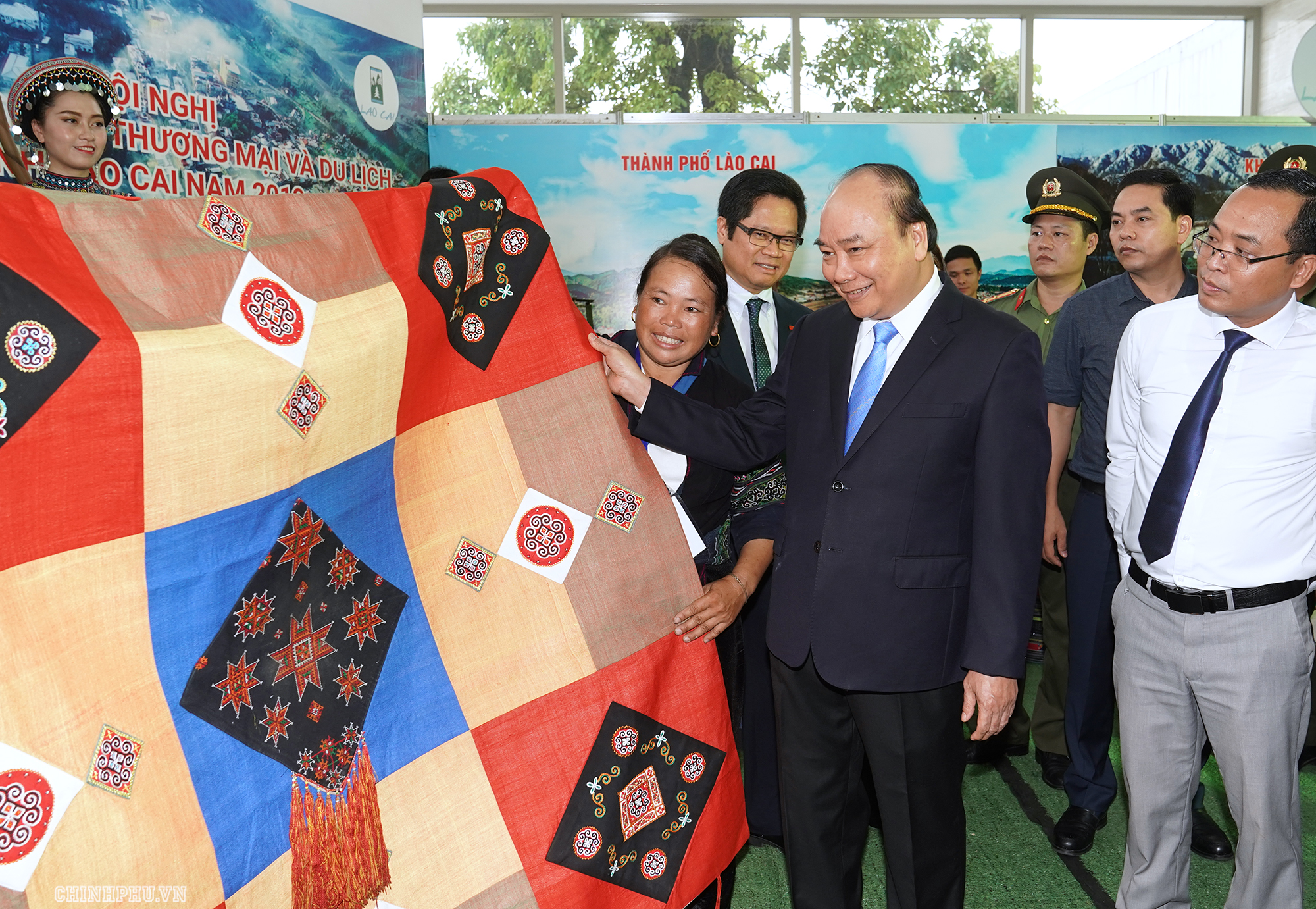 Thủ tướng thăm các gian hàng trưng bày sản phẩm của Lào Cai. Ảnh: Quang Hiếu |