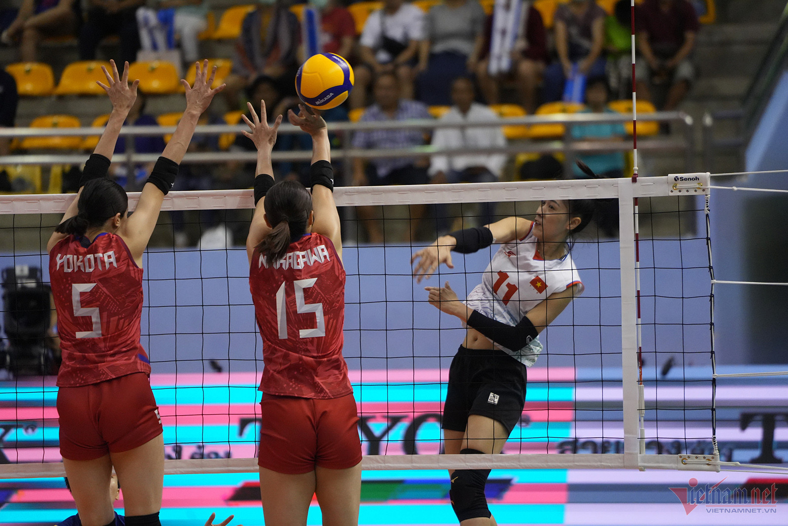 Kiều Trinh đập bóng ở vị trí số 2 khiến hàng chắn Nhật Bản lúng túng phòng thủ bất thành.