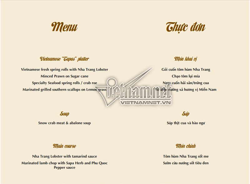 Theo nguồn tin của VietNamNet, thực đơn gồm 8 món.