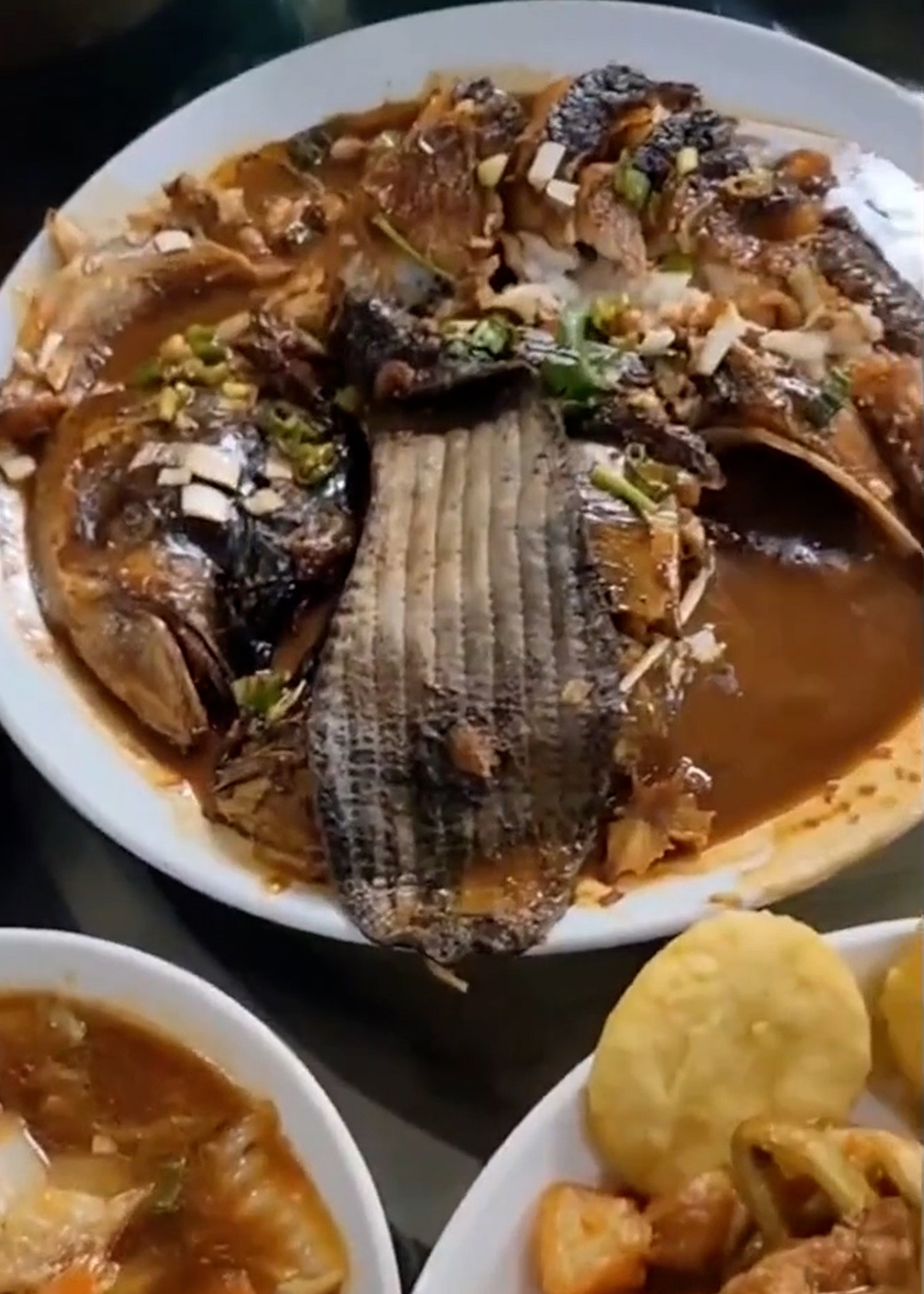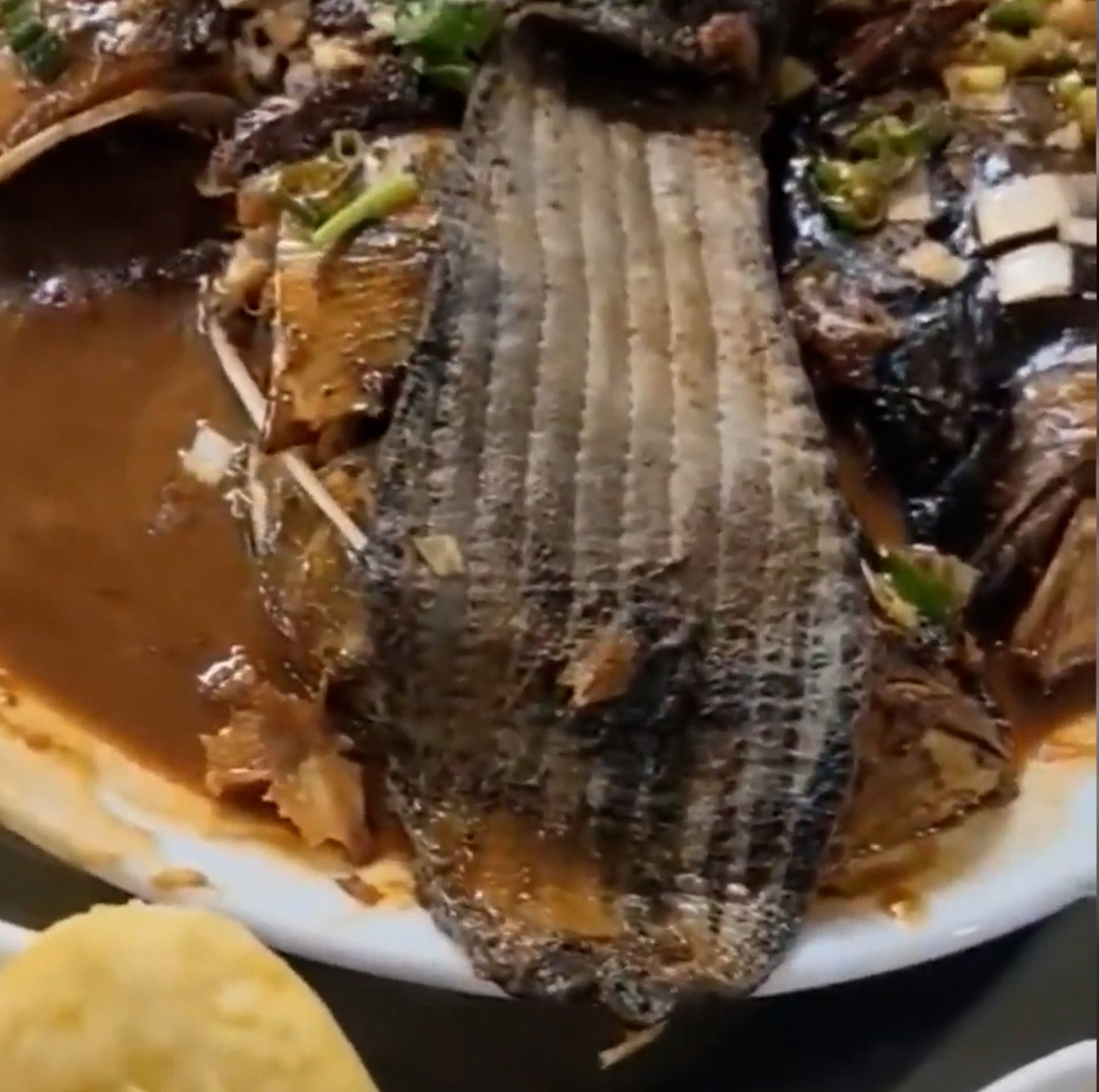 Sau khi dùng qua một số món, nhà hàng tiếp tục phục vụ món cá hầm nối tiếng của quán. Khi đĩa cá được bưng lên, mùi thơm đã tràn ngập khắp bàn ăn. Tuy nhiên, sau khi quan sát kỹ, cô Liu phát hiện một vật giống như miếng vải thò ra bên ngoài đĩa.