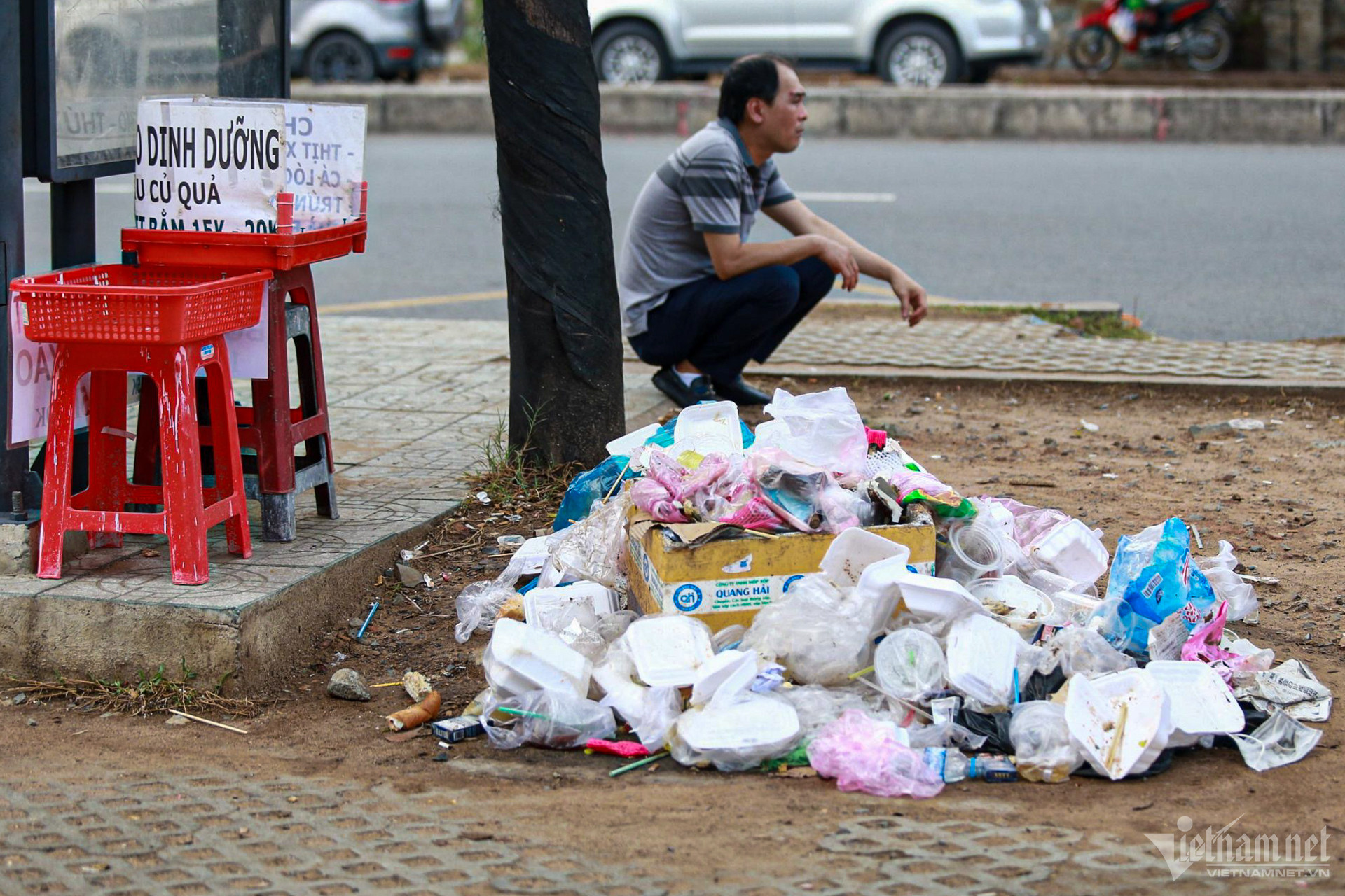 Khách ngồi ăn ngay trên vỉa hè, không cần bàn. Nhiều bãi rác đã phần chỉ toàn là hộp đựng đồ ăn, túi nylon được quăng ngay bên các hàng quán.