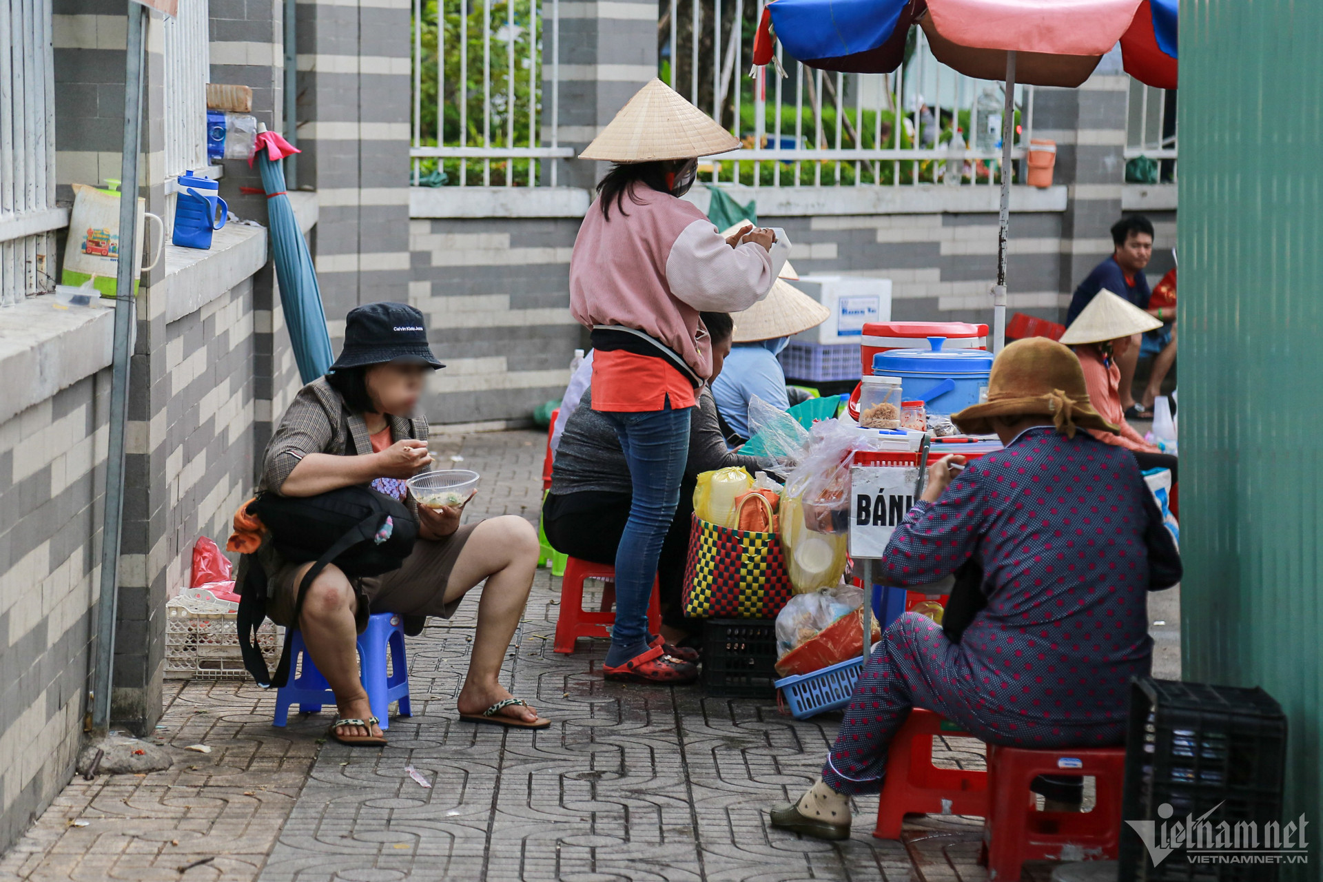 Tại cổng bệnh viện Ung Bướu 2 (TP Thủ Đức) cũng có hàng chục hàng rong hết sức "đơn sơ". Chị em chỉ cần dùng thùng xốp, ghế đỏ để kê đồ bày bán.
