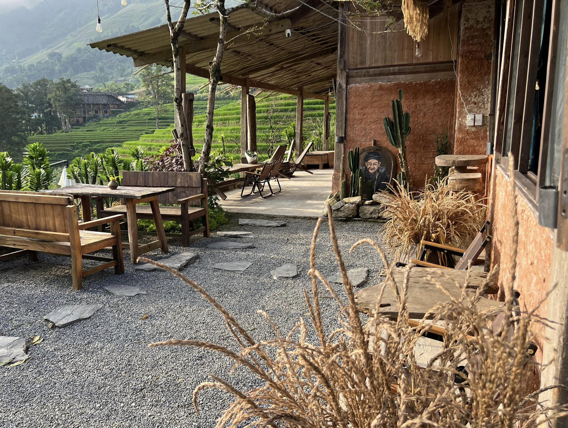 Ở khu vực nghỉ ngơi, vợ chồng Thùy Giang ưu tiên thiết kế theo tiêu chí tối giản, song vẫn toát lên bản sắc văn hóa của người dân vùng cao. Họ tận dụng các vật dụng thô sơ của bà con địa phương, kết hợp cùng những bức tranh về người dân tộc thiểu số để trang trí.