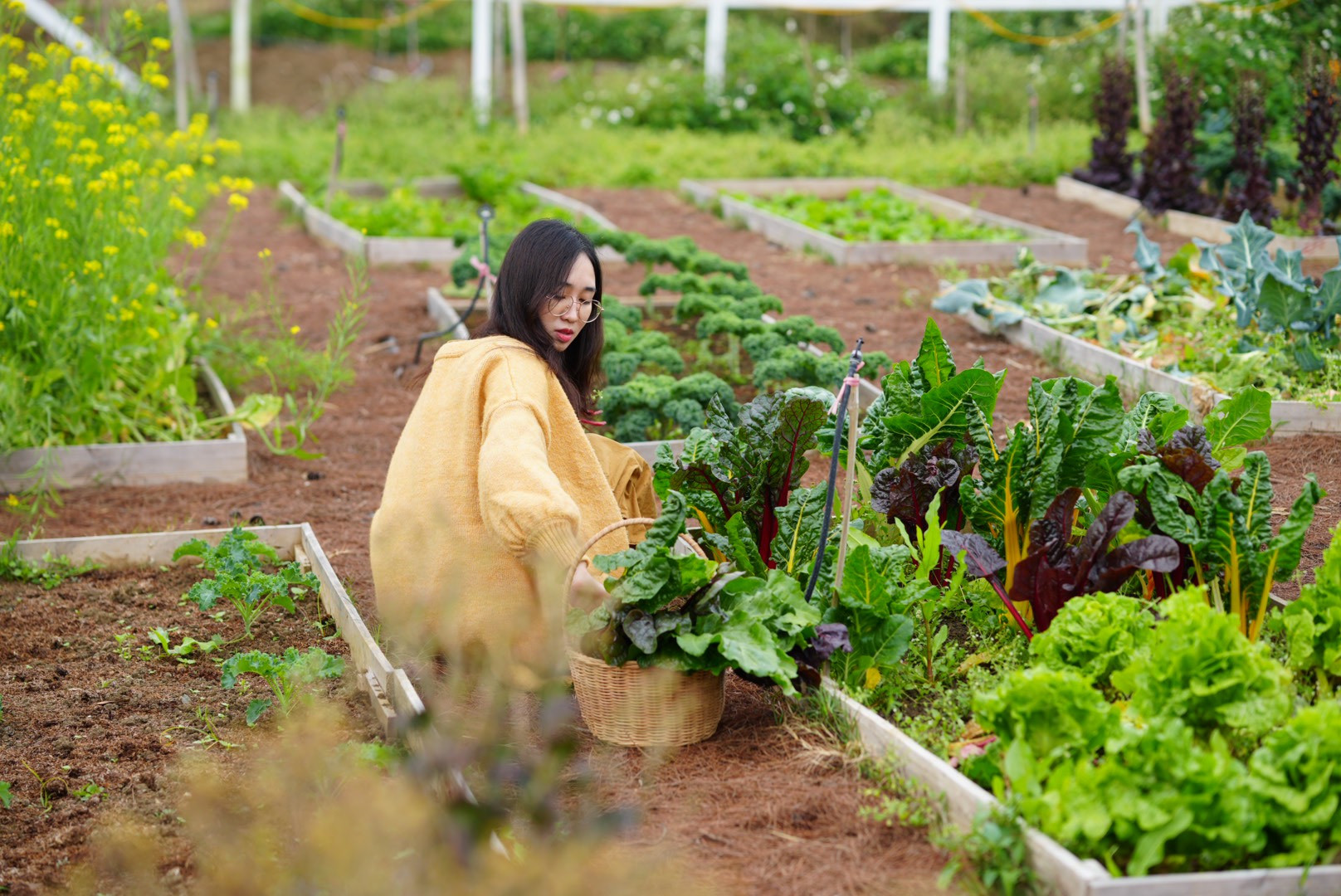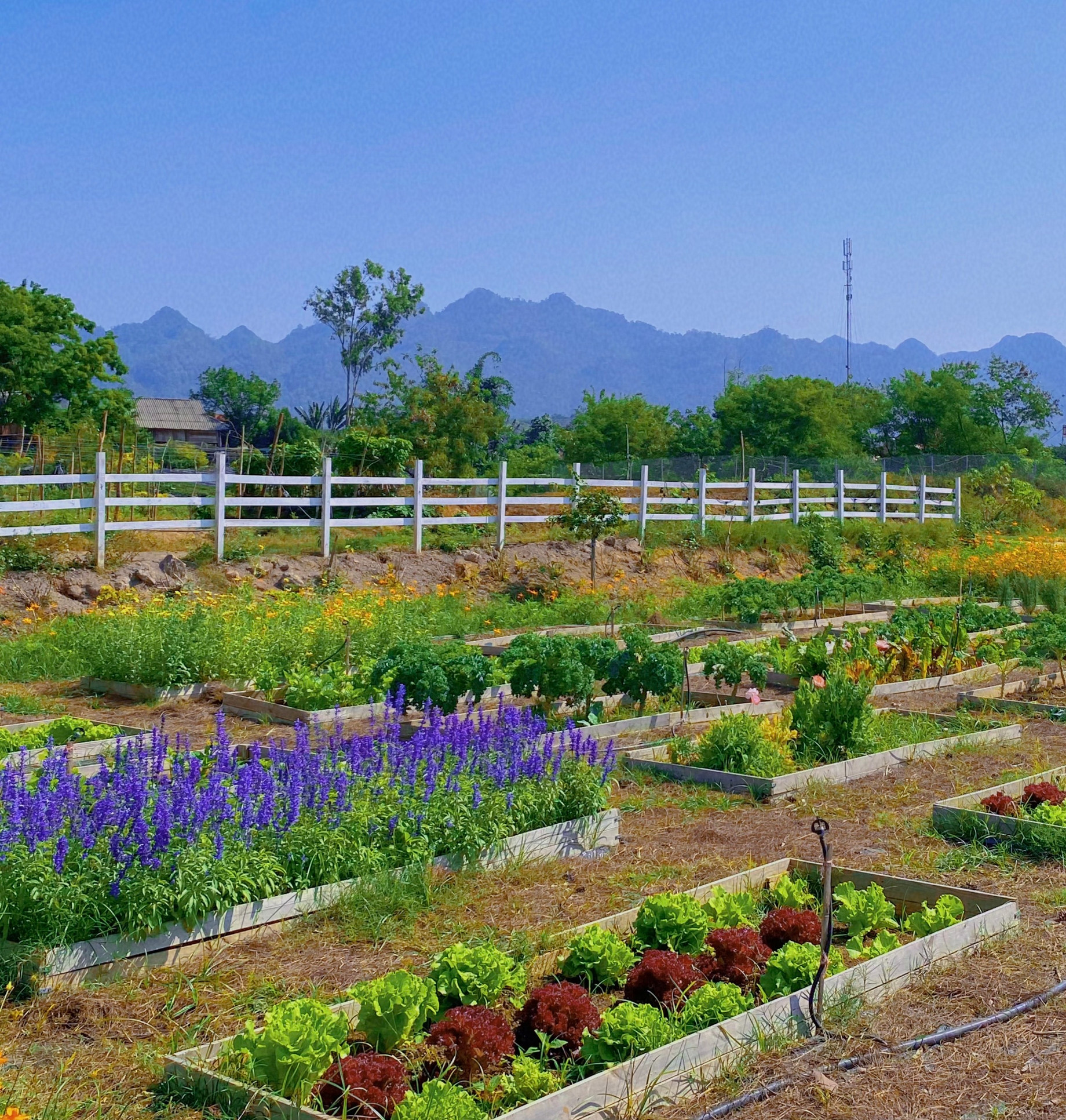 Ngoài ra, chị Linh còn phân chia mảnh đất thành các khu vực với đủ công năng, như khu trồng hoa tô điểm cảnh quan thêm đẹp mắt, khu trồng rau có diện tích chừng 600m2 để chủ động nguồn thực phẩm sạch mỗi ngày.