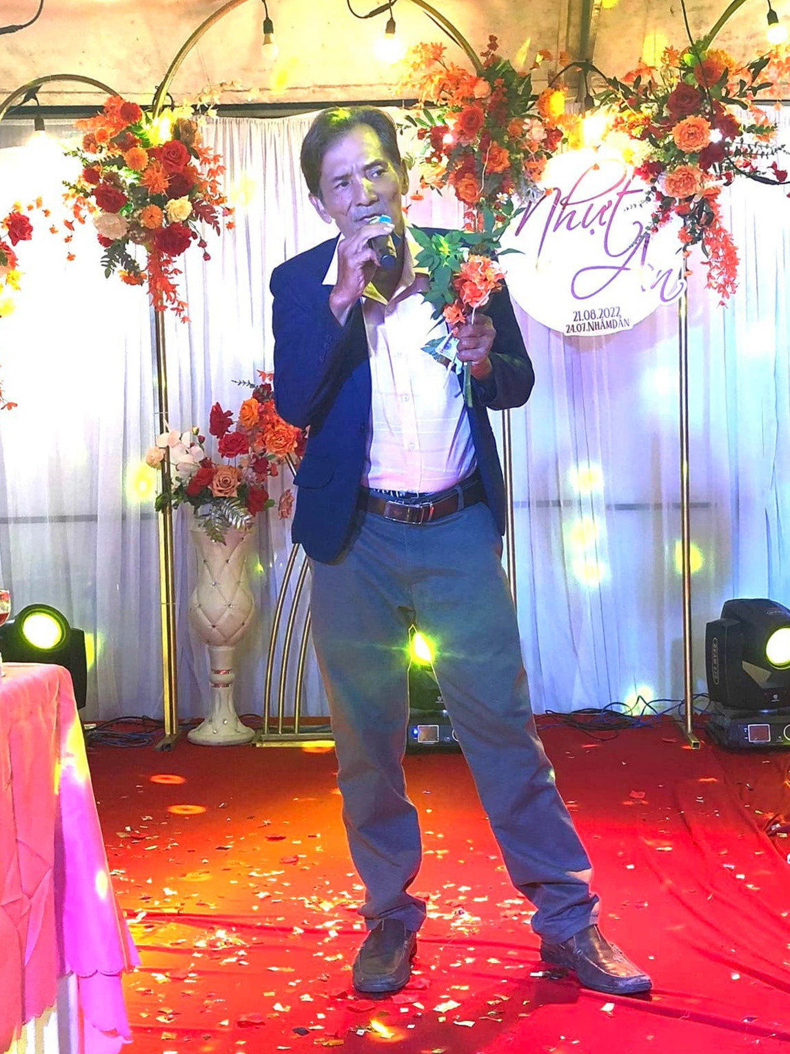 Tại đây, nhiều người trong buổi tiệc bày tỏ mong muốn nghe Thương Tín hát nên diễn viên gạo cội lên sân khấu.