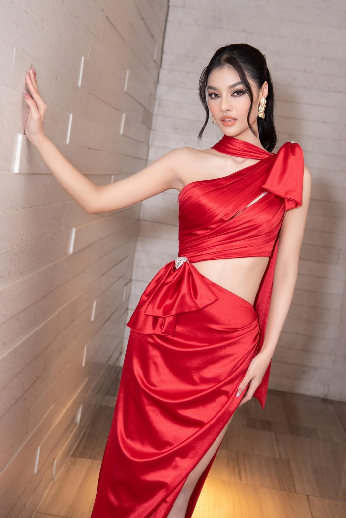 Á hậu Thuỷ Tiên sang trọng khi diện đầm nhung màu xanh coban với chi tiết xẻ sâu khoe trọn bờ vai thon. Người đẹp Đồng Tháp trang điểm theo tone cam nude, phối cùng bộ trang sức đắt giá đồng màu với trang phục.