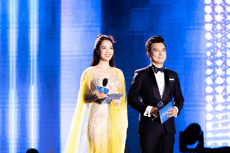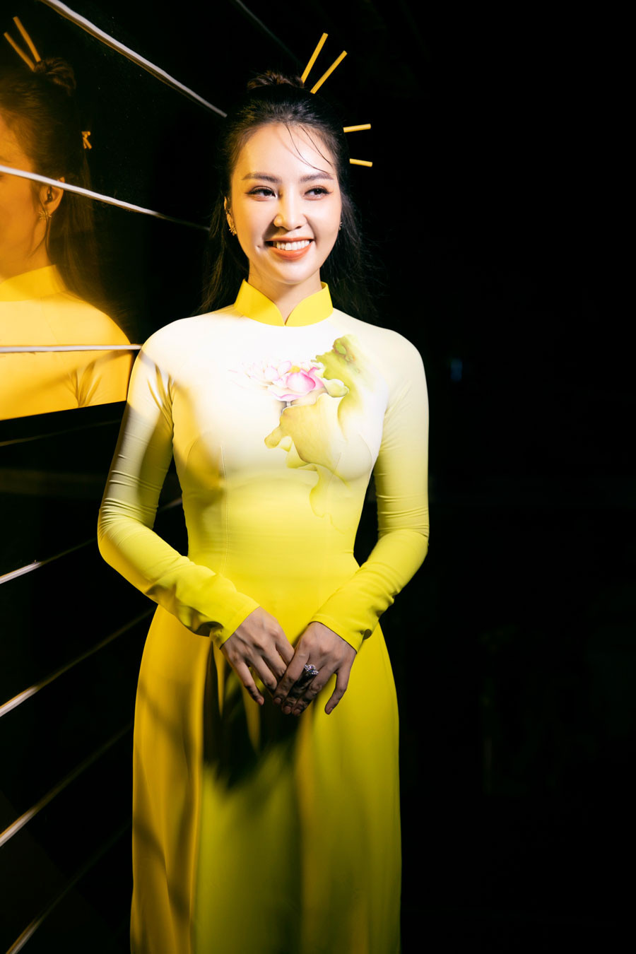 Xuất hiện với vai trò là MC của Chung kết Hoa hậu thế giới Việt Nam, Á hậu Thuỵ Vân nổi bật với trang phục áo dài hoa sen của NTK Trung Đinh.