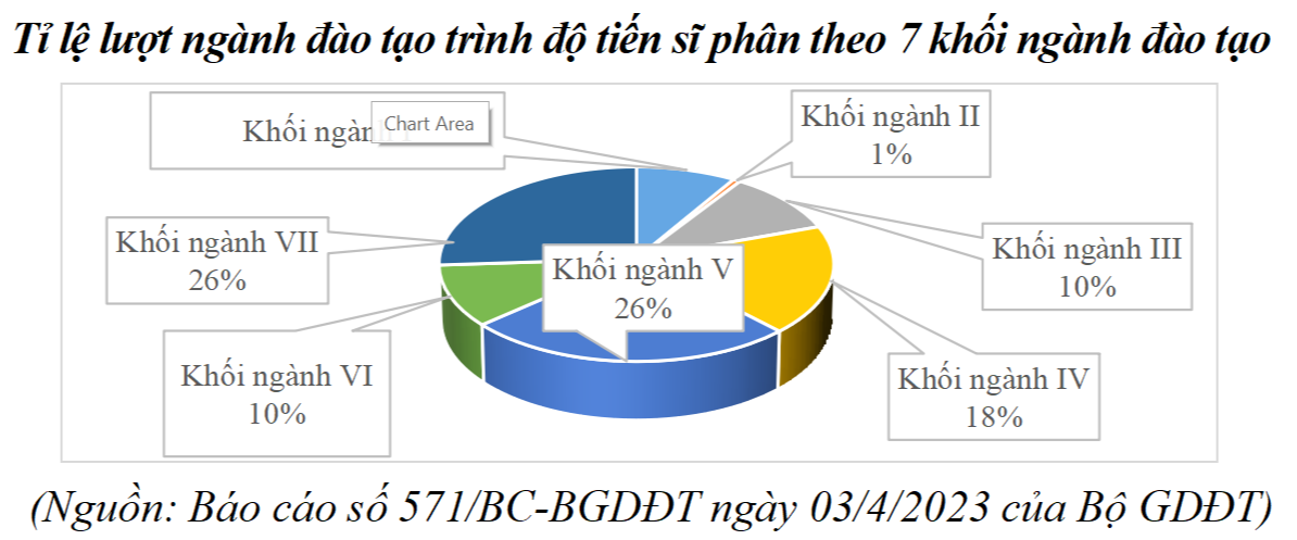 Bên cạnh đó, cơ cấu ngành nghề trong tuyển sinh, đào tạo trình độ tiến sĩ có sự mất cân đối. Tỉ lệ nghiên cứu sinh đang học tập tại các cơ sở đào tạo tập trung nhiều vào các ngành thuộc khối ngành VII, các ngành Kinh doanh và quản lý thuộc khối ngành III và các ngành Kỹ thuật, Máy tính và công nghệ thông tin thuộc khối ngành V.