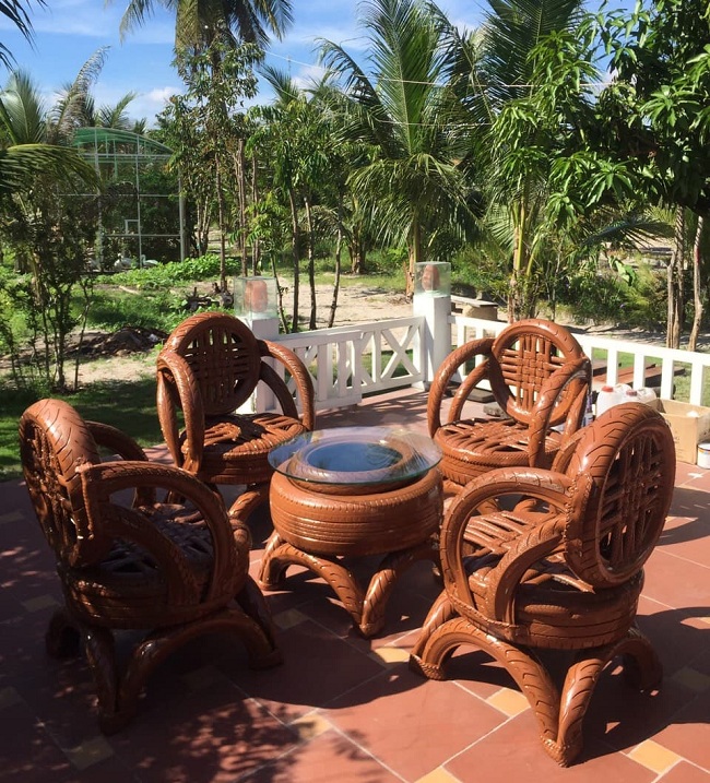 Những bộ bàn ghế gồm bàn tròn, bàn chữ nhật có mặt kính hoặc mặt gỗ. Mỗi chiếc ghế đều có lưng tựa, tay vịn được chế tác hoàn toàn tinh xảo từ lốp xe.