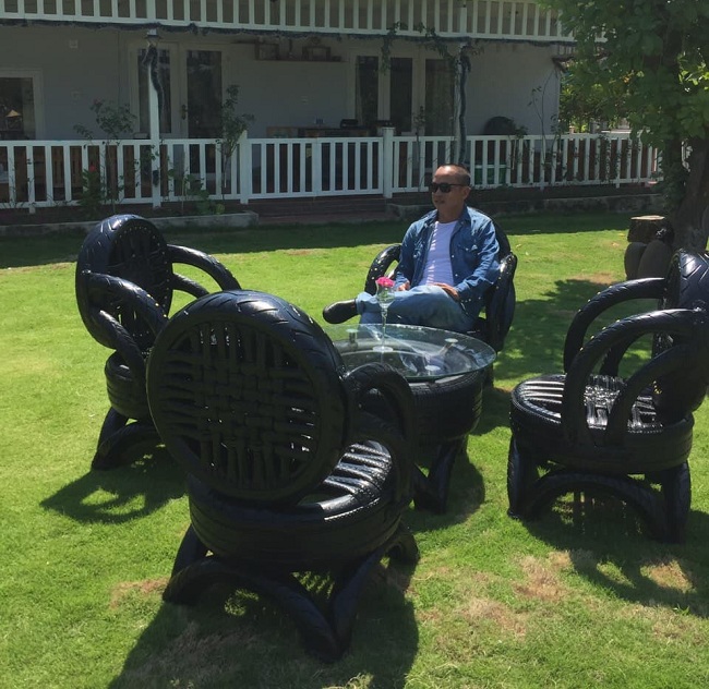 Anh Dương Anh Vũ bên bộ bàn ghề từ lốp do anh tái chế