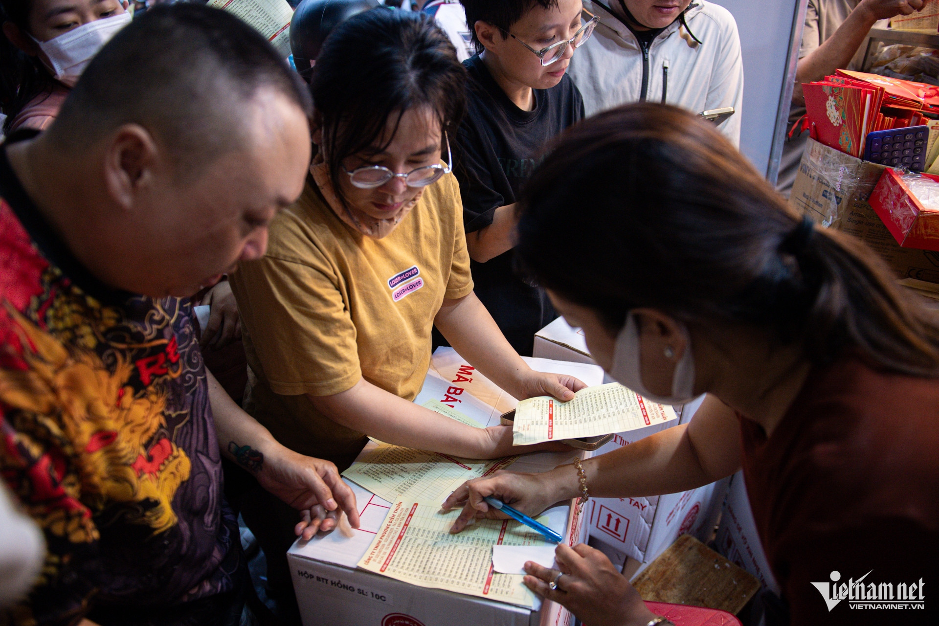 Cứ khoảng 15 đến 20 phút, nhân viên lại đẩy thêm các thùng hàng mới ra phía trước để bổ sung bánh vào tủ kính và giao cho khách sỉ. Bên trong, hơn 20 nhân viên liên tục nhận đơn, tính tiền và đóng hộp, hầu như không ngơi tay.