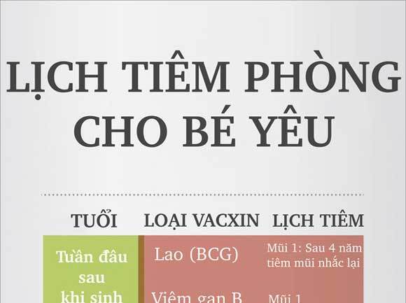 Dưới đây là lịch tiêm chủng cho các con mà bố mẹ cần chú ý ghi nhớ. Bạn có thể in lịch này và dán ở nơi dễ dàng nhìn thấy ngay trong nhà!