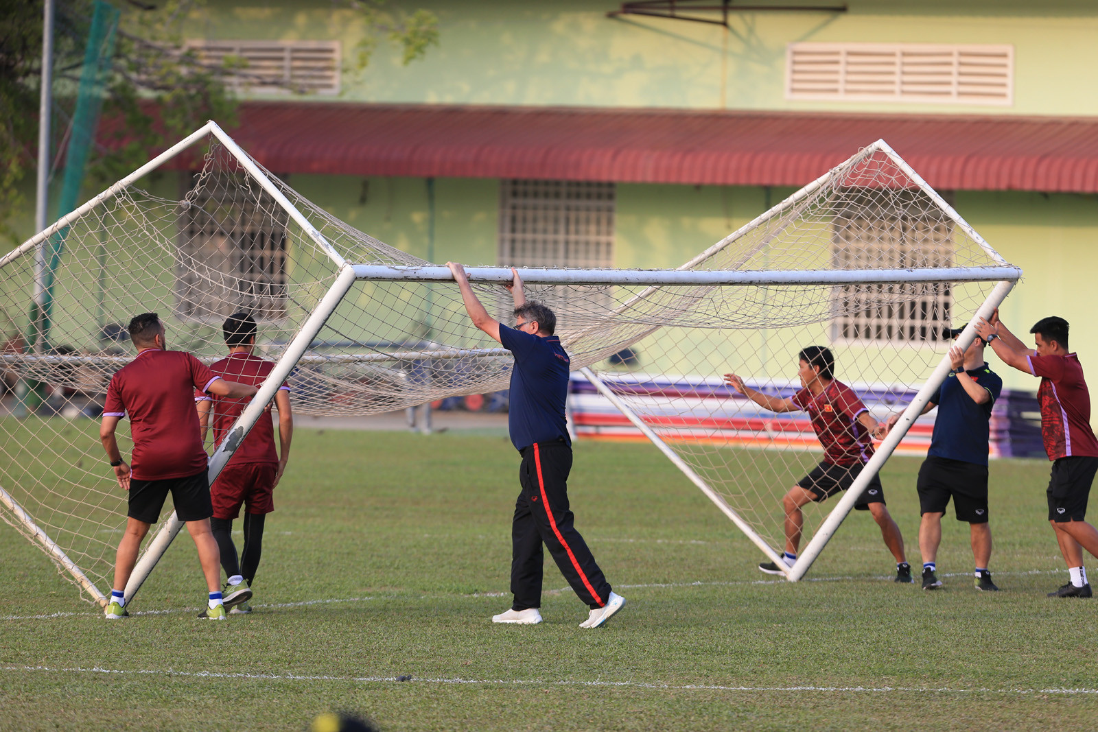 HLV Philippe Troussier đưa vào buổi tập những trò chơi tạo nên bầu không khí vui vẻ. Ông thầy người Pháp còn trực tiếp cùng các trợ lý khiêng khung thành giúp các học trò tập luyện. Tin vui với U22 Việt Nam là không có cầu thủ nào gặp chấn thương, có thể ra sân với đội hình mạnh nhất trận gặp Singapore.