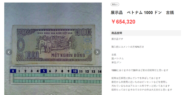 Một tờ tiền cũ 1.000 đồng Việt Nam bất ngờ được rao bán trên một trang thương mại ở Nhật Bản với mức giá gần 140 triệu đồng khi quy đổi sang tiền Việt.