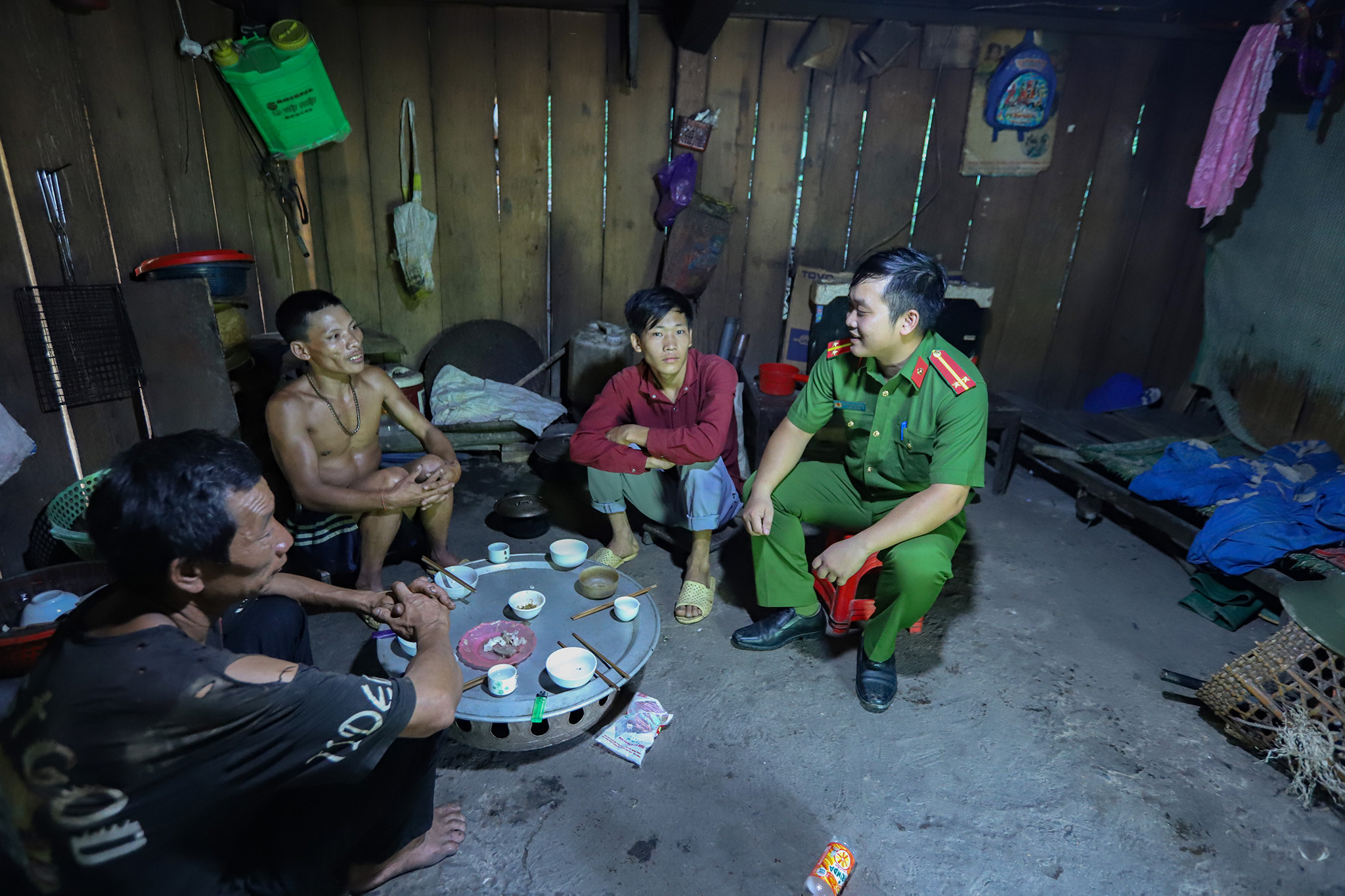 Bên trong căn nhà 3 cứng được Bộ Công an cấp gần như không có một vật dụng gì đáng giá. Buổi sáng của gia đình anh Xá và nhiều người dân Bum Tở thường bắt đầu bằng khói thuốc lào, rượu trắng rồi say sưa cả ngày.