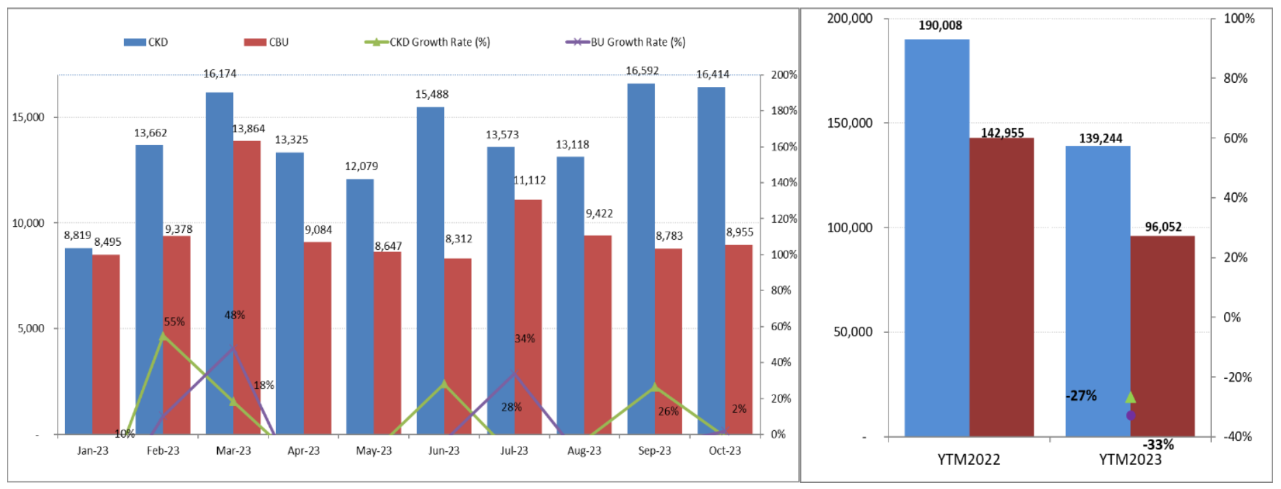 Kết thúc tháng 10, theo số liệu mới nhất của Hiệp hội các nhà sản xuất ô tô Việt Nam (VAMA), doanh số bán hàng của toàn thị trường ô tô là 25.369 xe, giảm nhẹ so với tháng 9/2023 và giảm 31% so với tháng 10/2022. Con số này bao gồm 19.624 xe du lịch (giảm 0,2%), 5.604 xe thương mại (tăng 1%) và 141 xe chuyên dụng (giảm 14%).