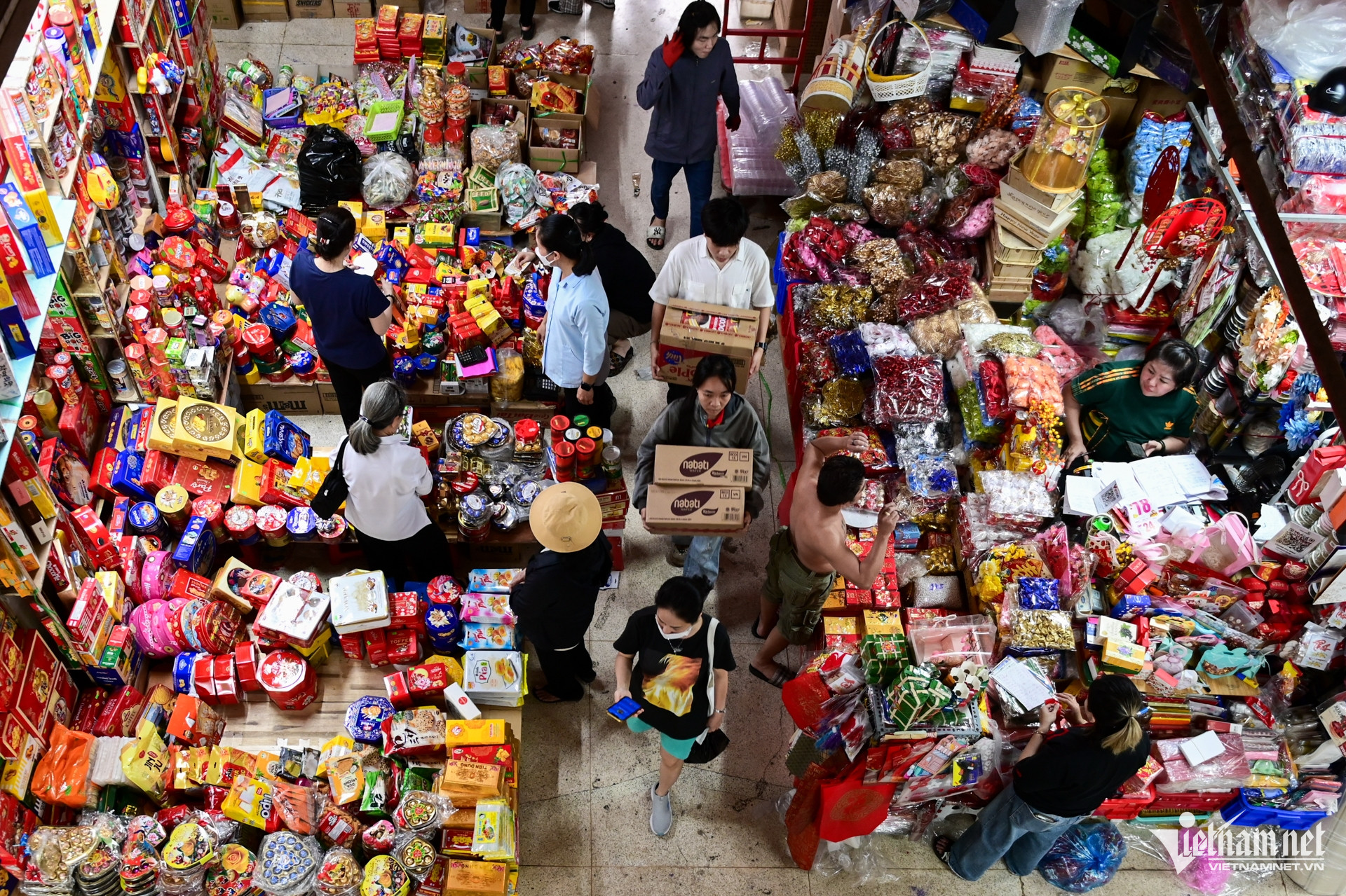 Thời điểm này, nhiều người dân, tiểu thương đổ về chợ Bình Tây (quận 6). Đây là khu chợ chuyên cung cấp thực phẩm, bánh kẹo và nhiều loại hàng hóa khác.