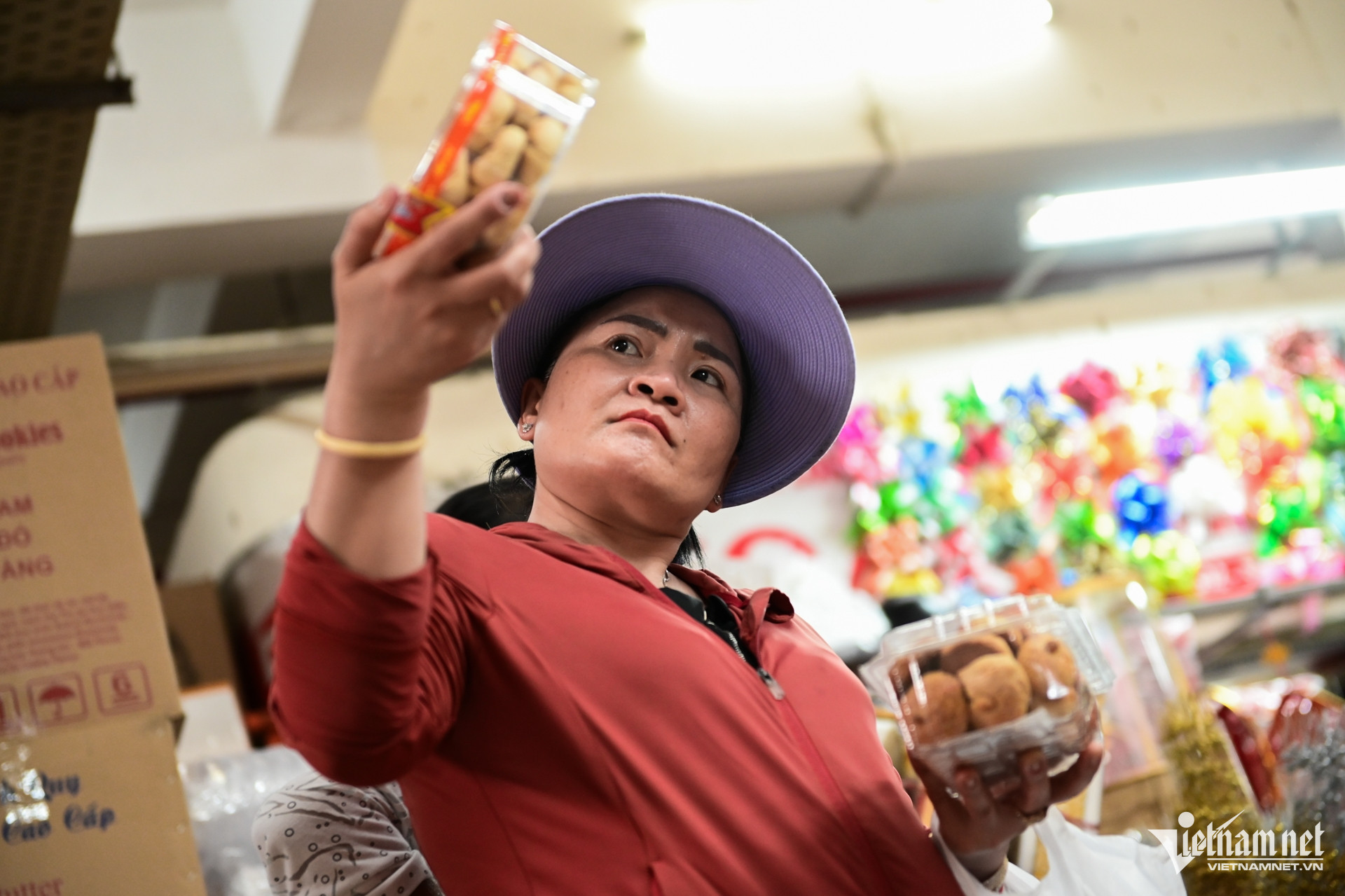 Trong ảnh là chị Thùy Linh đang cẩn thận xem hạn sử dụng của các loại bánh kẹo. Chị bắt đầu lấy hàng Tết về bán lẻ từ hơn 1 tuần trước, song do sức mua chậm nên chỉ dám nhập từ 20-30kg cho mỗi loại sản phẩm.