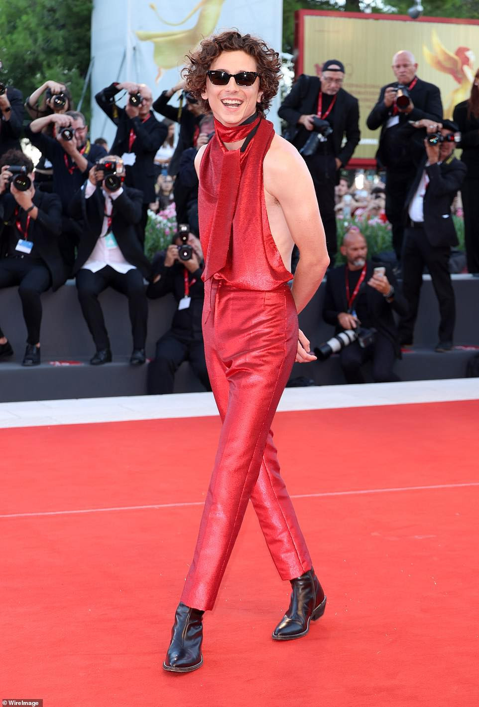 Nam diễn viên diện quần với chất liệu bóng, áo hở toàn bộ lưng và quàng 1 chiếc khăn đỏ hờ hững để hoàn tất set đồ. Timothée Chalamet diện boot đen kết hợp kính dâm cực kỳ ấn tượng.