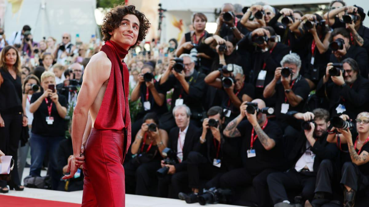 Nam diễn viên chọn trang phục màu đỏ rực với áo cổ yếm lạ mắt của nhà thiết kế Haider Ackermann khi dự buổi công chiếu phim Bones and All. Trang phục của Timothée Chalamet được truyền thông nhận định là đã phá vỡ những chuẩn mực phối đồ đơn thuần, xứng đáng là biểu tượng đột phá của thời trang tại Venice.