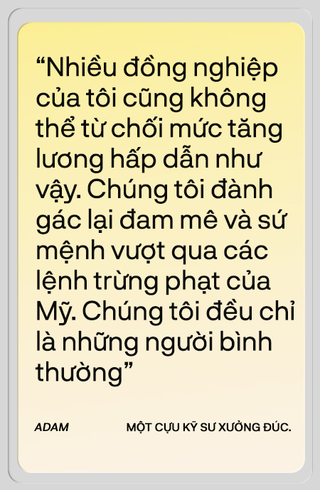 “Nhiều đồng nghiệp của tôi cũng không thể từ chối mức tăng lương hấp dẫn như vậy”, Adam nói. “Chúng tôi đành gác lại đam mê và sứ mệnh vượt qua các lệnh trừng phạt của Mỹ. Chúng tôi đều chỉ là những người bình thường”.