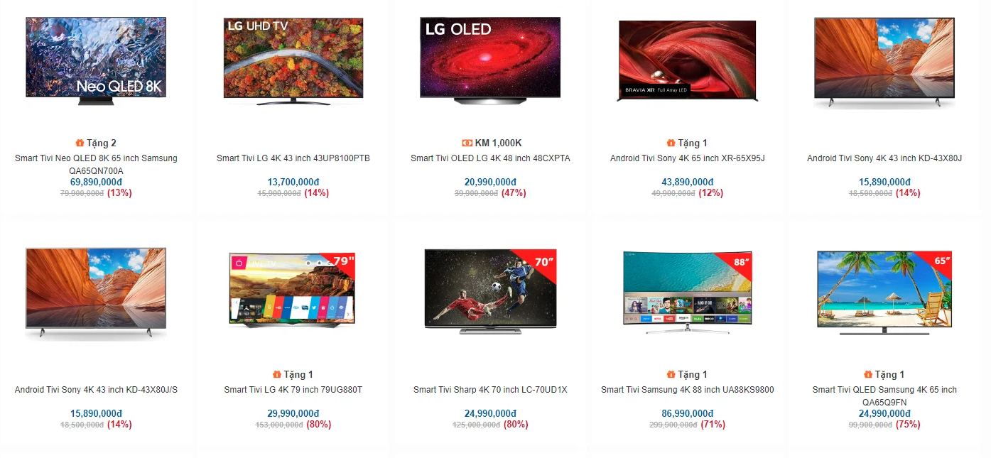Nhiều mẫu tivi được giảm giá sâu trên thị trường. (Ảnh chụp màn hình) |