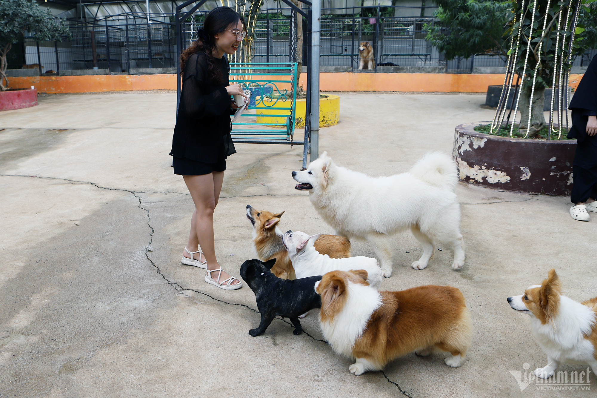 Khi tới Đà Lạt, được bạn giới thiệu địa điểm này, Linh ghé tới rồi tỏ ra thích thú khi lại gần các chú cún. “Ở đây có nhiều giống chó, khá đa dạng. Chúng trông ngoan, thân thiện”, nói rồi Linh cầm hộp chứa xúc xích, trêu đùa và cho những chú chó ăn.
