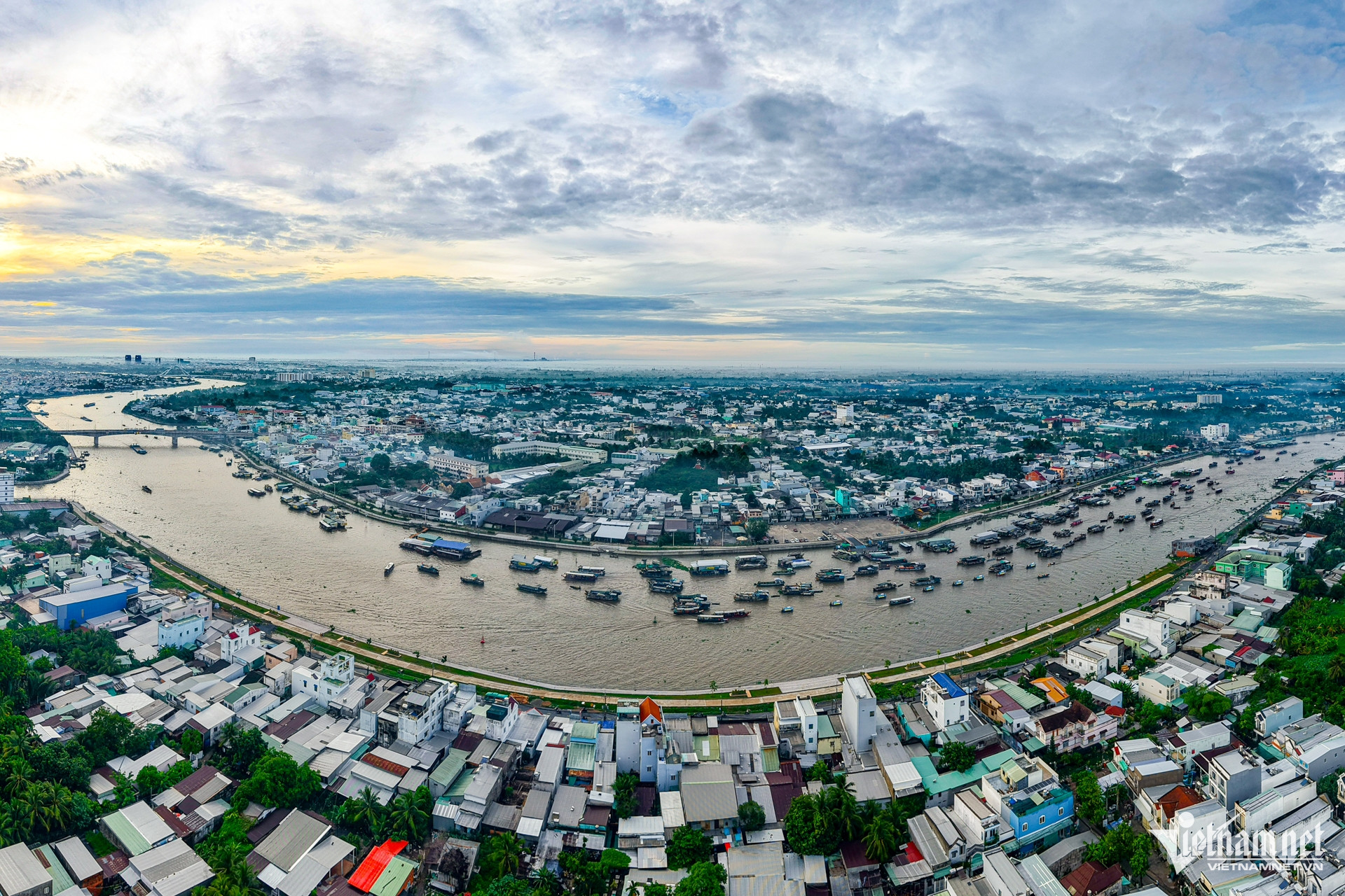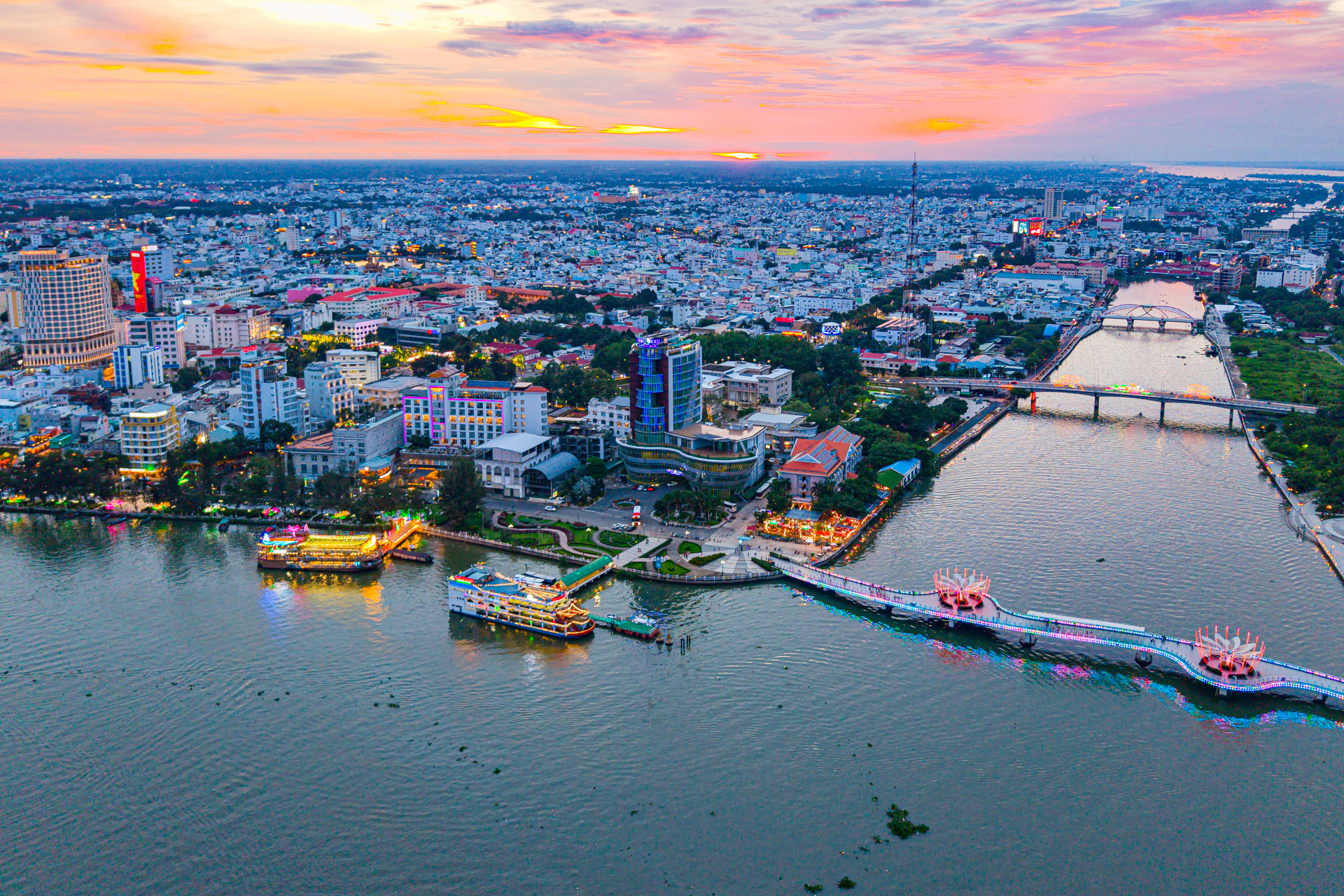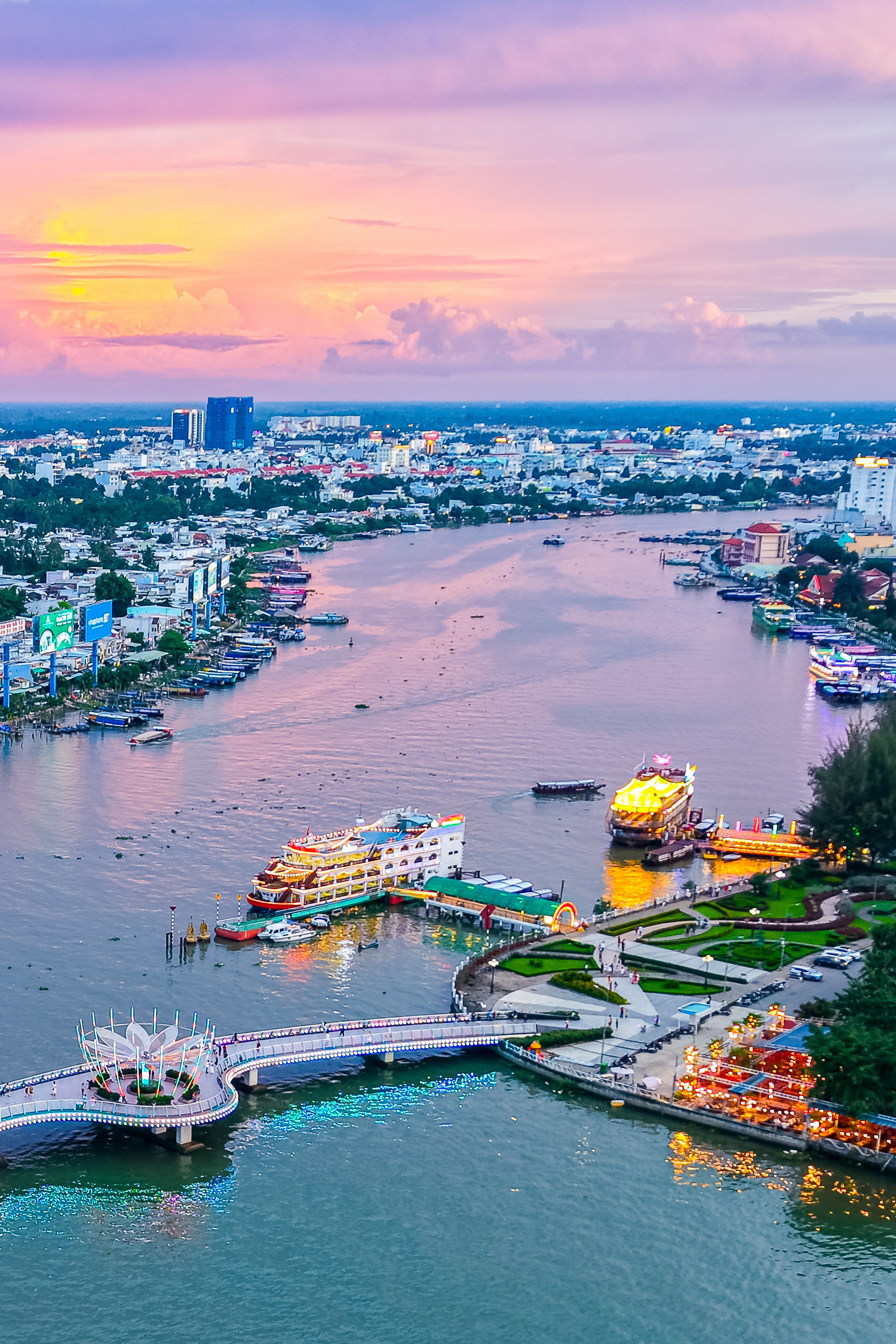 Được mệnh danh là Tây Đô - nơi đô hội của vùng châu thổ ĐBSCL, trải dài 65km bên bờ sông Hậu, thành phố nổi bật với hệ thống sông ngòi, kênh rạch đan xen cùng nhiều cây cầu hiện đại. Trong ảnh là cầu đi bộ bến Ninh Kiều, cầu Ninh Kiều, những điểm nhấn kiến trúc giữa lòng đô thị sông nước; phía xa là cầu Cần Thơ vắt ngang sông Hậu, kết nối thành phố với tỉnh Vĩnh Long.