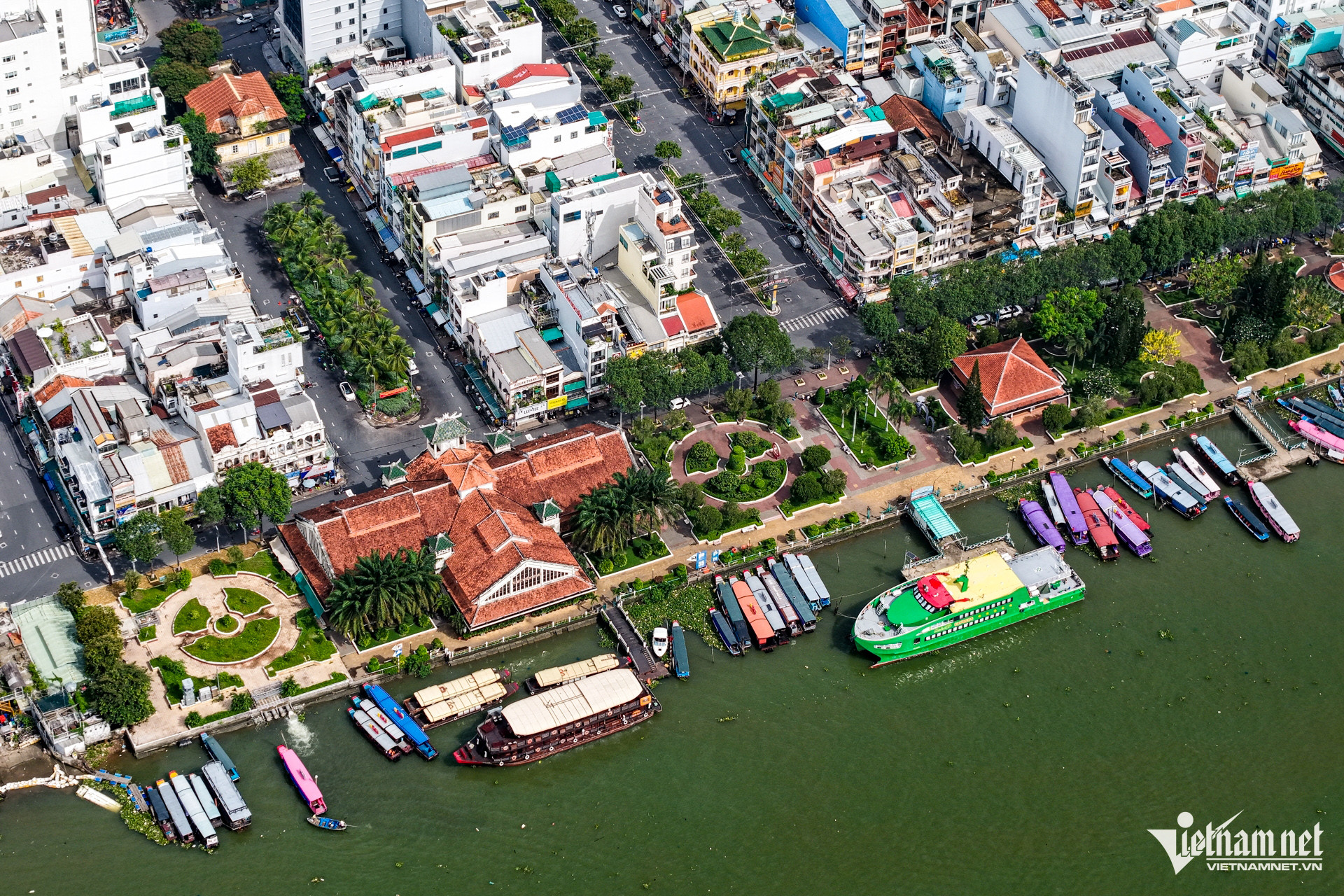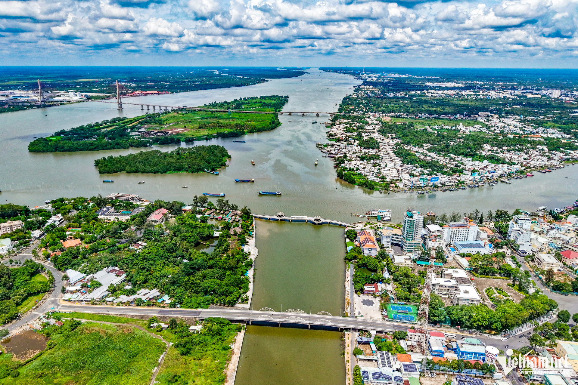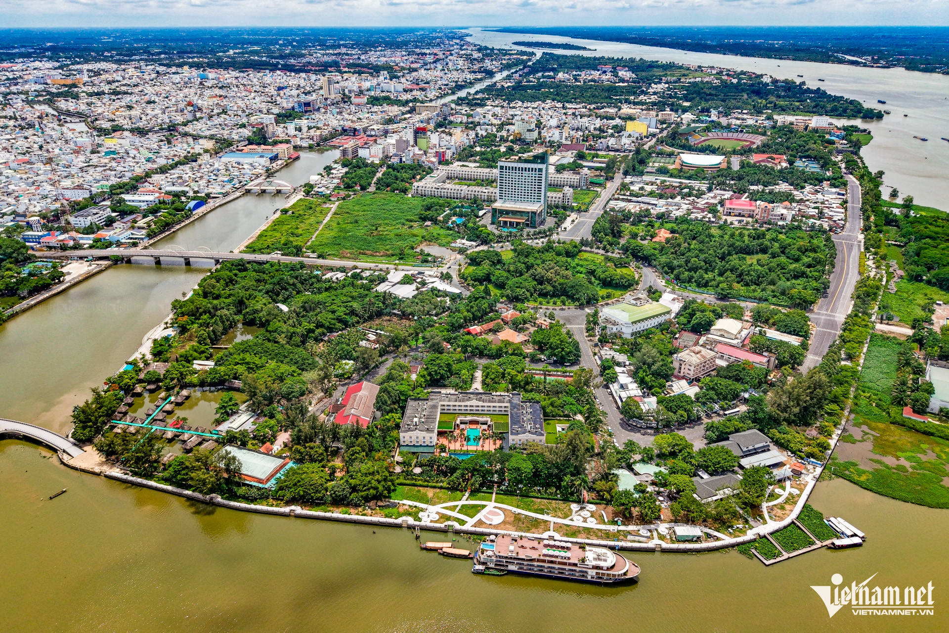 Được mệnh danh là Tây Đô - nơi đô hội của vùng châu thổ ĐBSCL, trải dài 65km bên bờ sông Hậu, thành phố nổi bật với hệ thống sông ngòi, kênh rạch đan xen cùng nhiều cây cầu hiện đại. Trong ảnh là cầu đi bộ bến Ninh Kiều, cầu Ninh Kiều, những điểm nhấn kiến trúc giữa lòng đô thị sông nước; phía xa là cầu Cần Thơ vắt ngang sông Hậu, kết nối thành phố với tỉnh Vĩnh Long.
