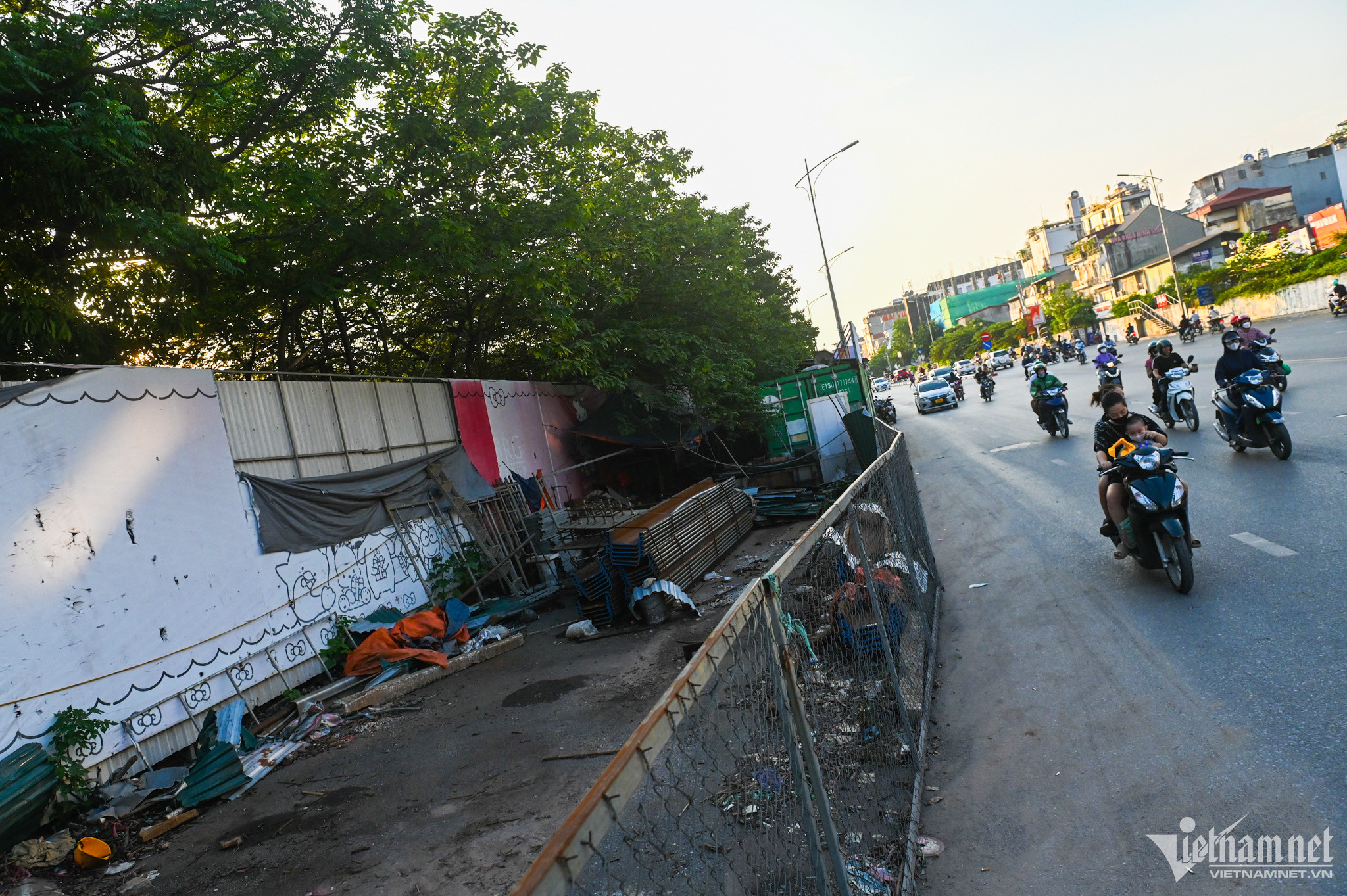 Dù đã 5 năm, đến nay khu đất này vẫn được quây tôn kín mít, cổng ra vào khóa trái. Vỉa hè bên ngoài chất đầy vật liệu xây dựng.