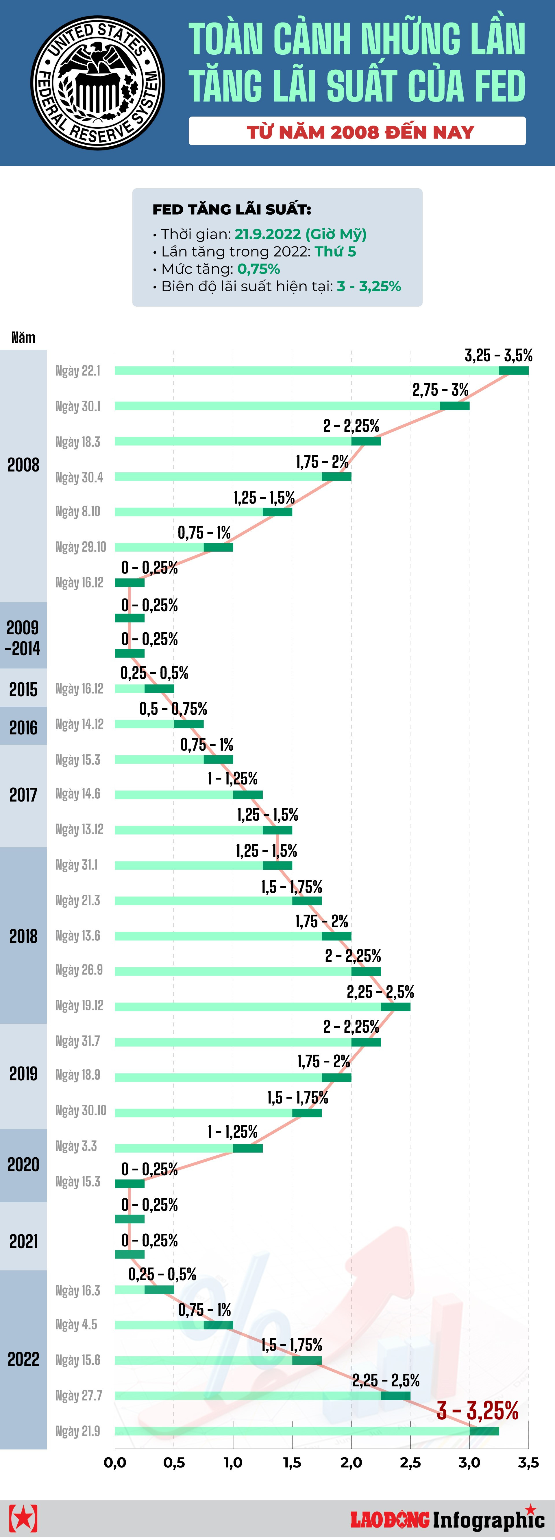 Ngày 21.9 (giờ Mỹ), ngân hàng Dự trữ Liên bang Mỹ (FED) thông báo tăng lãi suất cơ bản thêm 0,75 điểm phần trăm, lên biên độ 3% - 3,25%. Đây là mức biên độ lãi suất cao nhất của FED kể từ tháng 1.2008.