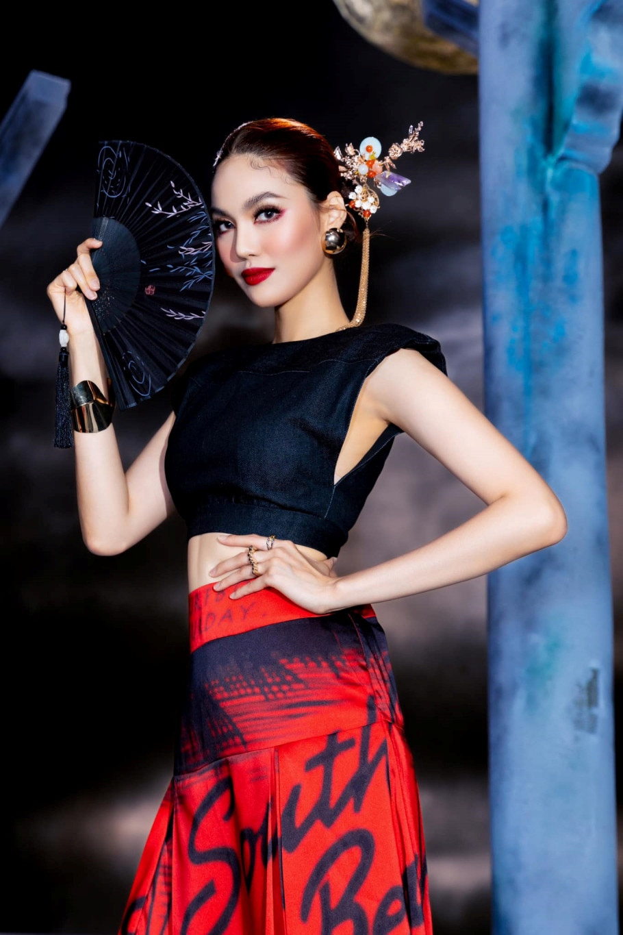 Thuỳ Tiên toát lên thần thái nữ hoàng khi diện thiết kế màu trắng với bra tạo hình cầu kỳ kèm mũ trùm vai và chân váy xẻ cao có phần tà dài thướt tha. Người đẹp sinh năm 1998 để tóc rẽ ngôi, kết hợp cùng trang sức đính đá và sandal cao gót màu bạc.