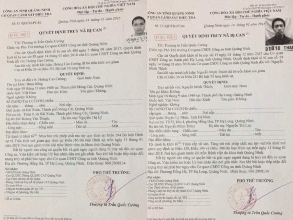 Hai can phạm bỏ trốn khỏi BV Đa khoa tỉnh Quảng Ninh vừa bị cơ quan công an phát lệnh truy nã.