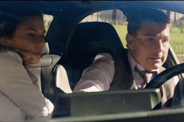 Dù bị còng tay với bạn diễn Hayley Atwell, tài tử Tom Cruise vẫn lái xe bằng một tay còn lại rượt đuổi trên đường phố Rome mà không cần đóng thế.