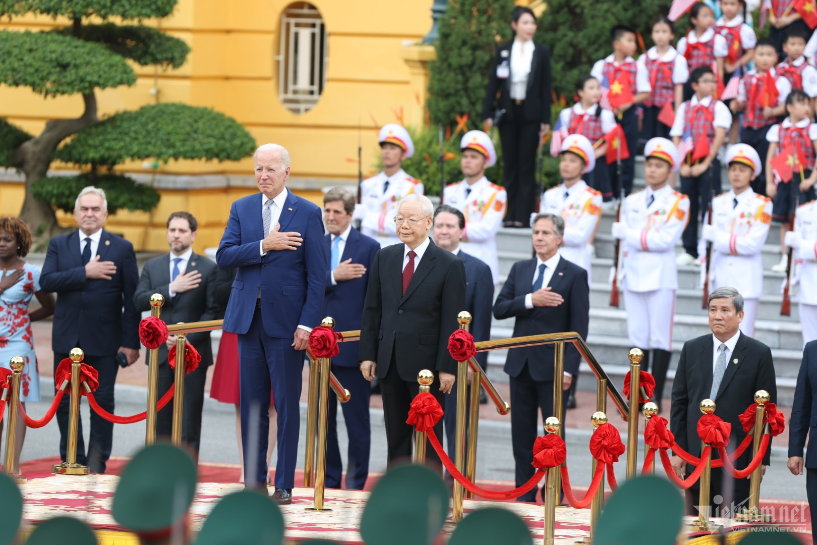 Tổng Bí thư Nguyễn Phú Trọng mời Tổng thống Joe Biden bước lên bục danh dự. Quân nhạc cử quốc thiều Mỹ và Việt Nam.