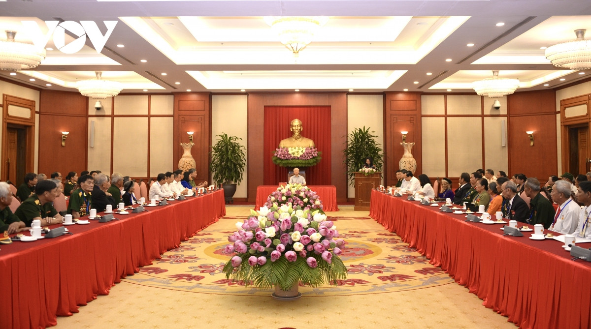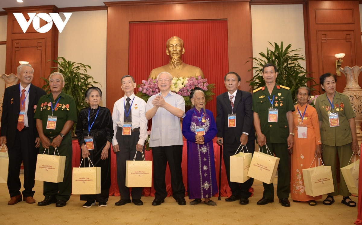 Tổng Bí thư Nguyễn Phú Trọng bày tỏ, hôm nay, được gặp mặt các cụ, các bác, các anh các chị, các đồng chí đại biểu tiêu biểu tại Trụ sở Trung ương Đảng hôm nay, tôi thật sự xúc động và rất vui mừng được thấy sức khoẻ, đời sống của các bậc lão thành cách mạng, các Mẹ Việt Nam anh hùng, các đồng chí thương binh, bệnh binh ngày càng được các cơ quan, đoàn thể, các tổ chức xã hội và nhân dân quan tâm chăm sóc chu đáo, và bản thân các đồng chí cũng có nhiều đóng góp tích cực trong cộng đồng, cho sự nghiệp đổi mới, công nghiệp hoá, hiện đại hoá đất nước và hội nhập quốc tế, tiếp tục góp phần xây dựng, phát triển, bảo vệ vững chắc Tổ quốc Việt Nam muôn vàn yêu quý của chúng ta.