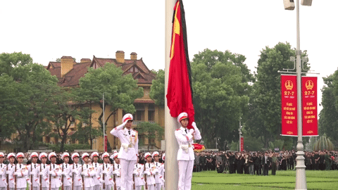 Hàng nghìn người đã tập trung tại Quảng trường Ba Đình, Hà Nội từ lúc 5:00 sáng, ngày 25/7 để chứng kiến nghi lễ thượng cờ rủ Quốc tang Tổng Bí thư Nguyễn Phú Trọng.