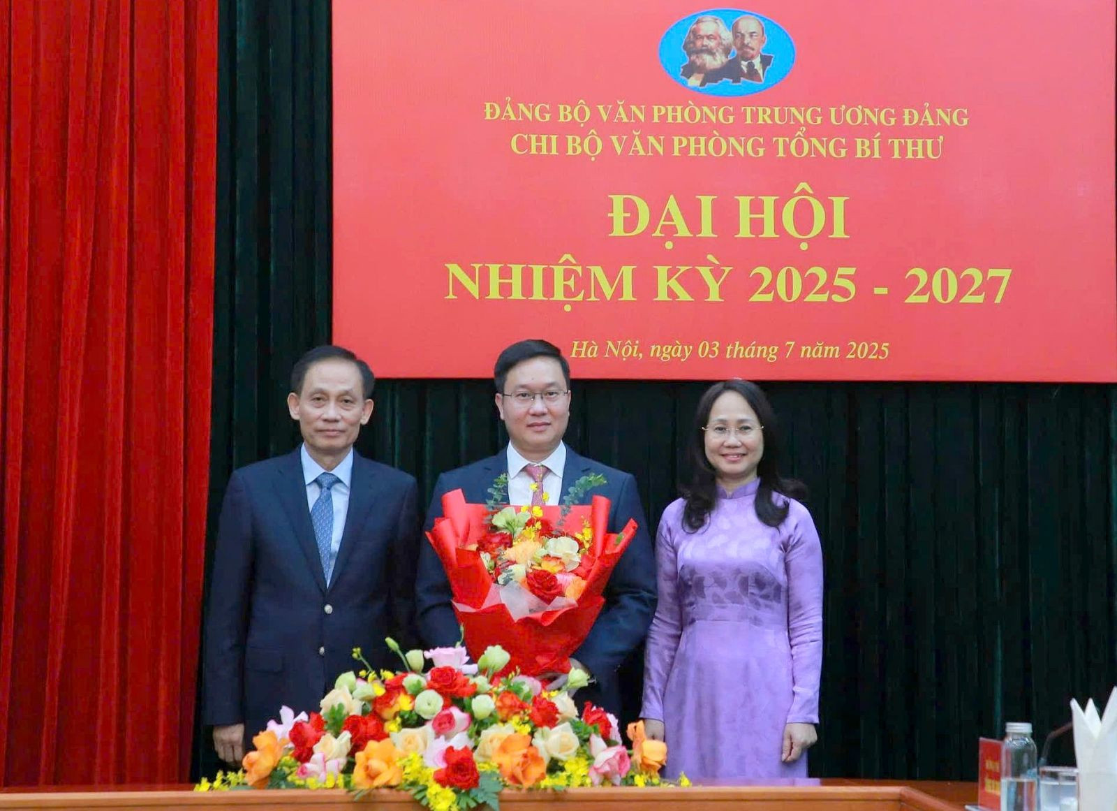 Đồng chí Lê Hoài Trung, Bí thư Trung ương Đảng, Chánh Văn phòng Trung ương Đảng và đồng chí Lâm Thị Phương Thanh, Ủy viên Trung ương Đảng, Phó Chánh Văn phòng Thường trực Văn phòng Trung ương Đảng, Bí thư Đảng ủy cơ quan chúc mừng Bí thư Chi bộ nhiệm kỳ 2025-2027.