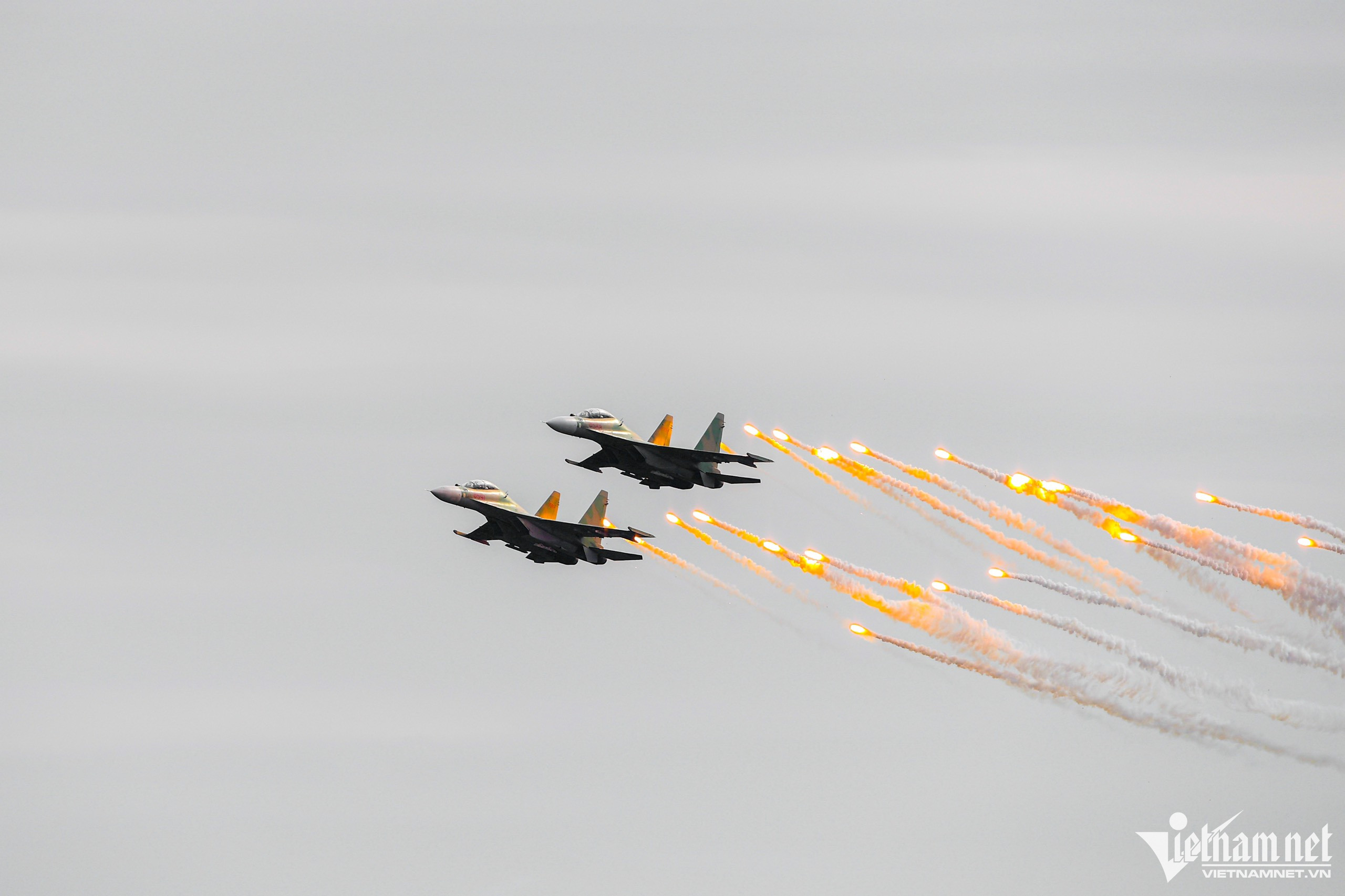 9h30, biên đội bốn chiếc tiêm kích Su-30MK2 trình diễn thả bẫy mồi nhiệt vang dội bầu trời.