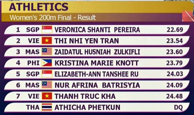 Ở chung kết chạy 200m nữ, Kha Thanh Trúc và Trần Thị Nhi Yến cùng góp mặt. VĐV của Thái Lan mắc lỗi xuất phát và bị loại, các VĐV phải xuất phát lại.