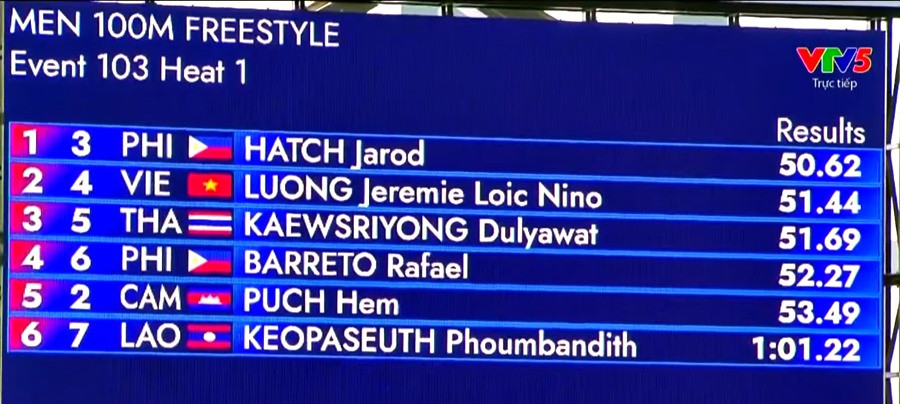 VĐV Việt kiều Pháp Jeremie Lương về đích thứ 2 ở lượt bơi thứ nhất vòng loại 100m tự do nam. Hoàng Quý Phước về đích thứ 4 ở lượt thứ 2.