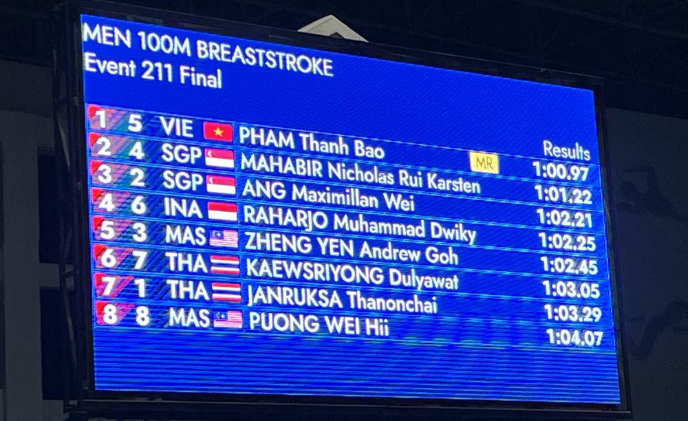 Thành tích của kình ngư quê Bến Tre là 1 phút 00 giây 97. HCB và HCĐ đều thuộc về 2 VĐV của Singapore.
