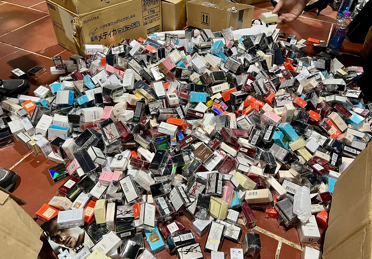 Tại đây, la liệt các sản phẩm, như: nước hoa Gucci, Chanel, Louis Vuitton, Dior, Boss, Sauvage, Lancôme, Kilian….; giày, dép, túi, ví các thương hiệu Louis Vuitton, Chanel, Adidas, Nike; mỹ phẩm các nhãn hiệu Vaseline, Bioderma.