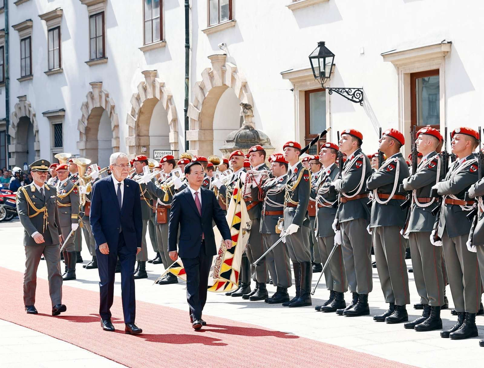 Đội trưởng Đội danh dự Áo chào Chủ tịch nước Võ Văn Thưởng và phu nhân. Quân nhạc cử Quốc thiều Việt Nam và Quốc thiều Áo. Đội trưởng Đội danh dự Áo mời Chủ tịch nước cùng Tổng thống Áo duyệt Đội danh dự. Tiếp đó, hai nhà lãnh đạo cùng tới giới thiệu và chào mừng thành viên đại biểu hai nước có mặt tại lễ đón.