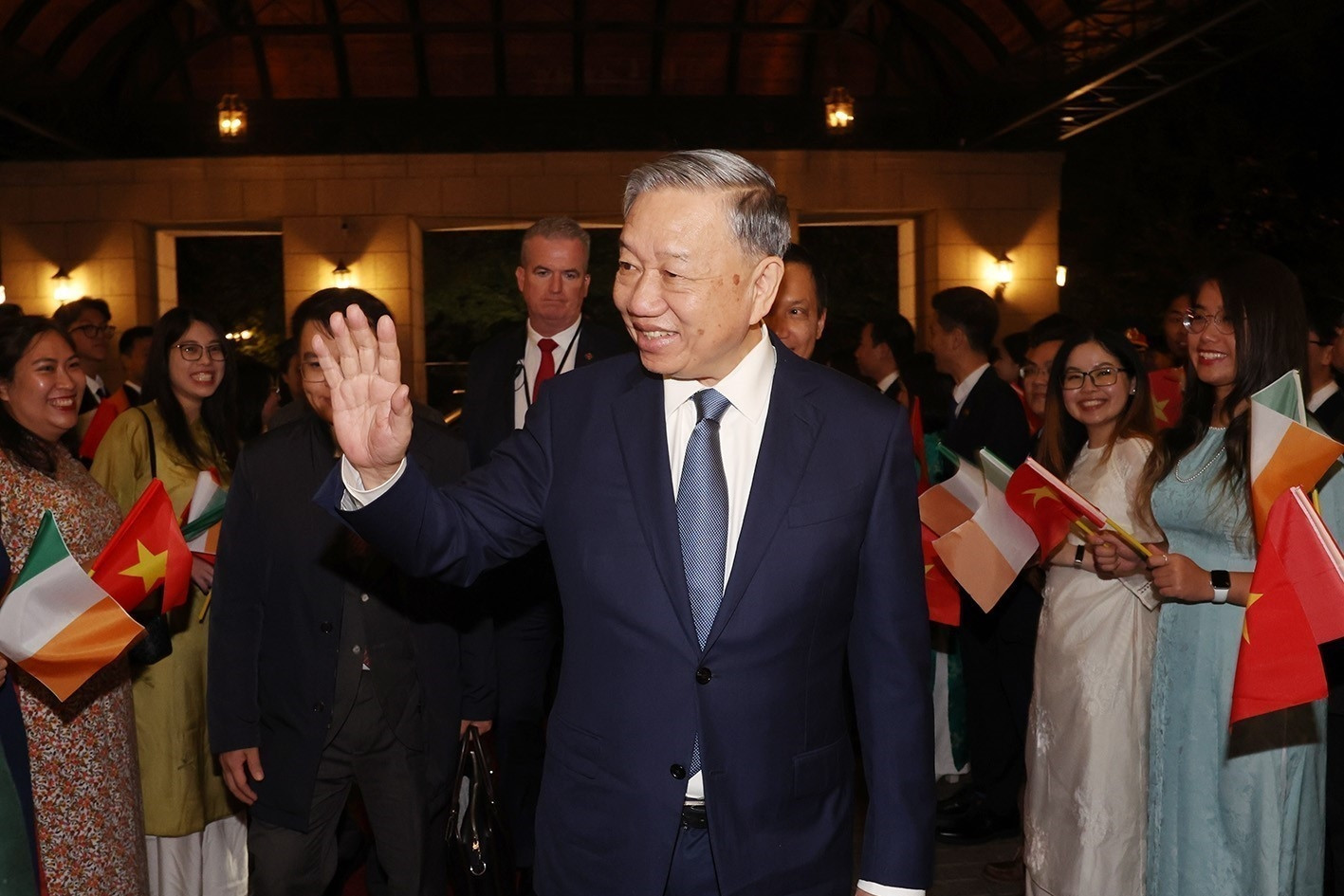 Lễ đón được tổ chức trọng thể tại Phủ Tổng thống Ireland. Tổng thống Ireland Michael D. Higgins và Phu nhân ra tận nơi đỗ xe đón Tổng Bí thư, Chủ tịch nước Tô Lâm; đông đảo các thiếu nhi Ireland cầm trên tay quốc kỳ hai nước vẫy chào.